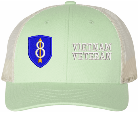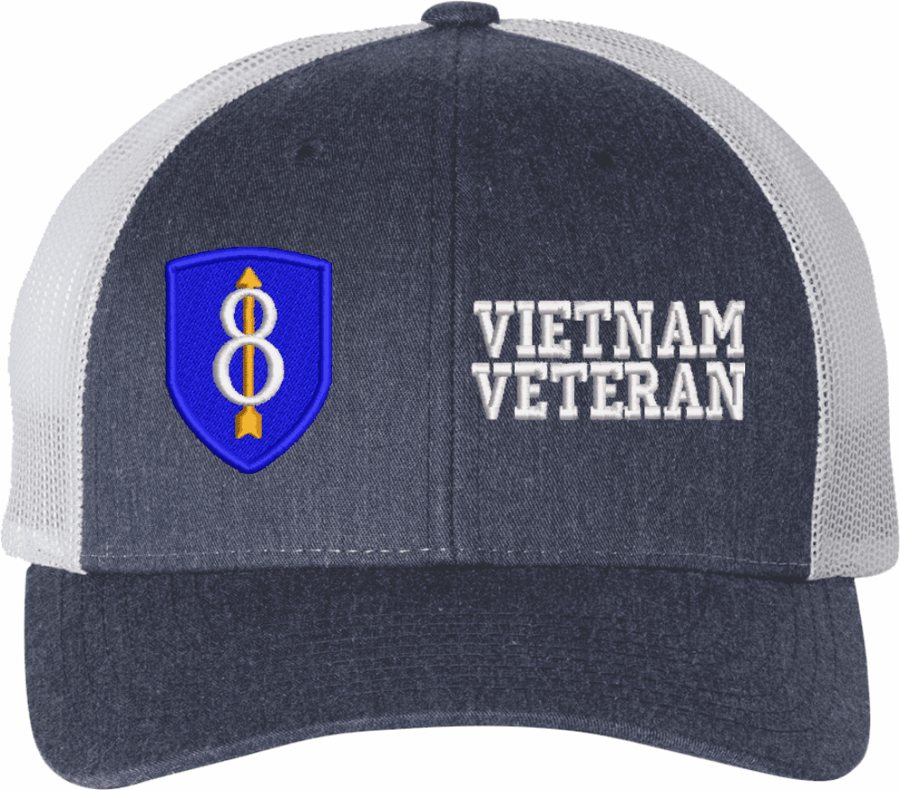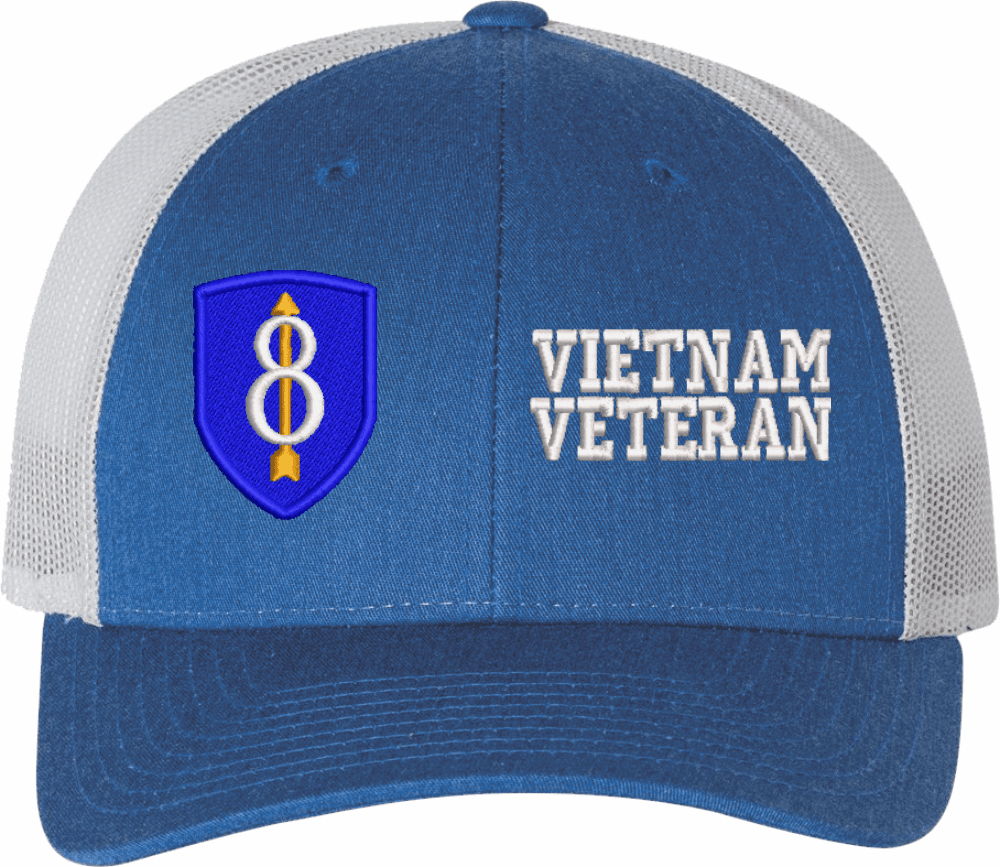 MilitaryBest is proud to offer this Mesh Back U.S. Army 8th Infantry Division Vietnam Veteran Women's Split-Cap. The design is embroidered onto a 6x panel mid/low profile mesh back cap and is crisp, clean, and sure to be loved by all! As with all MilitaryBest caps and apparel your satisfaction is guaranteed!Caps ordered with embroidered back text requires an additional 1 to 2 days of production time. All personalized caps will be embroidered in ALL CAPITAL LETTERS. Caps personalized with back text are not returnable unless there is a material defect in the cap.