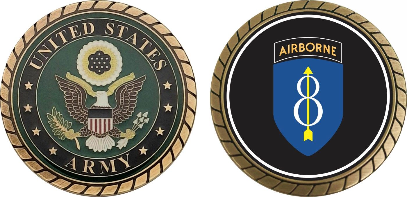 This 1 3/4” 8th Infantry Division with Airborne Tab Challenge Coin is proudly offered by Militarybest. This Officially Licensed Army coin has beautiful enamel finish on one side and an organized crisp clean design on the opposite side.