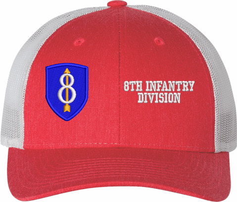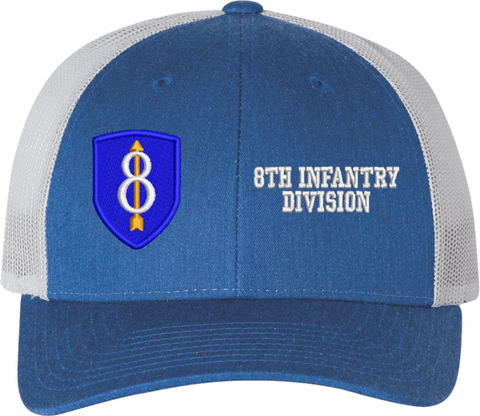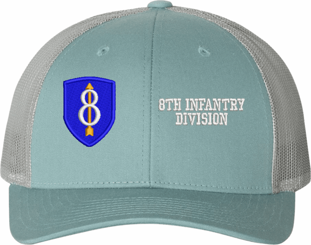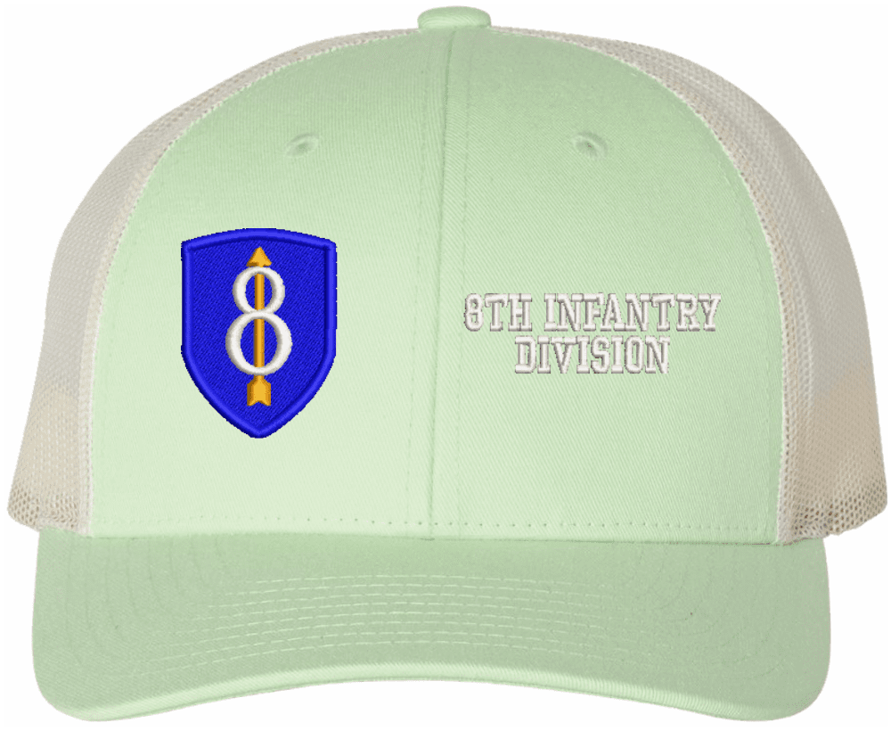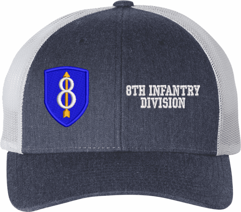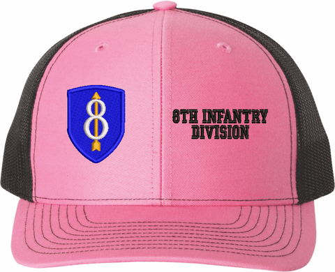 MilitaryBest is proud to offer this Mesh Back U.S. Army 8th Infantry Division Women's Split-Cap. The design is embroidered onto a 6x panel mid/low profile mesh back cap and is crisp, clean, and sure to be loved by all! As with all MilitaryBest caps and apparel your satisfaction is guaranteed!Caps ordered with embroidered back text requires an additional 1 to 2 days of production time. All personalized caps will be embroidered in ALL CAPITAL LETTERS. Caps personalized with back text are not returnable unless there is a material defect in the cap.