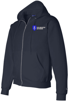 MilitaryBest is proud to offer this quality 8th Infantry Division Zippered Hoodie. Each U.S. Army Zippered Hoodie is direct embroidered onto either a Champion or Gildan brand Zippered Hoodie using a 9.5 oz 50/50 Cotton Poly blend material. These Military Zippered Hoodies are proudly embroidered at our facilities in Scottsboro, AL.