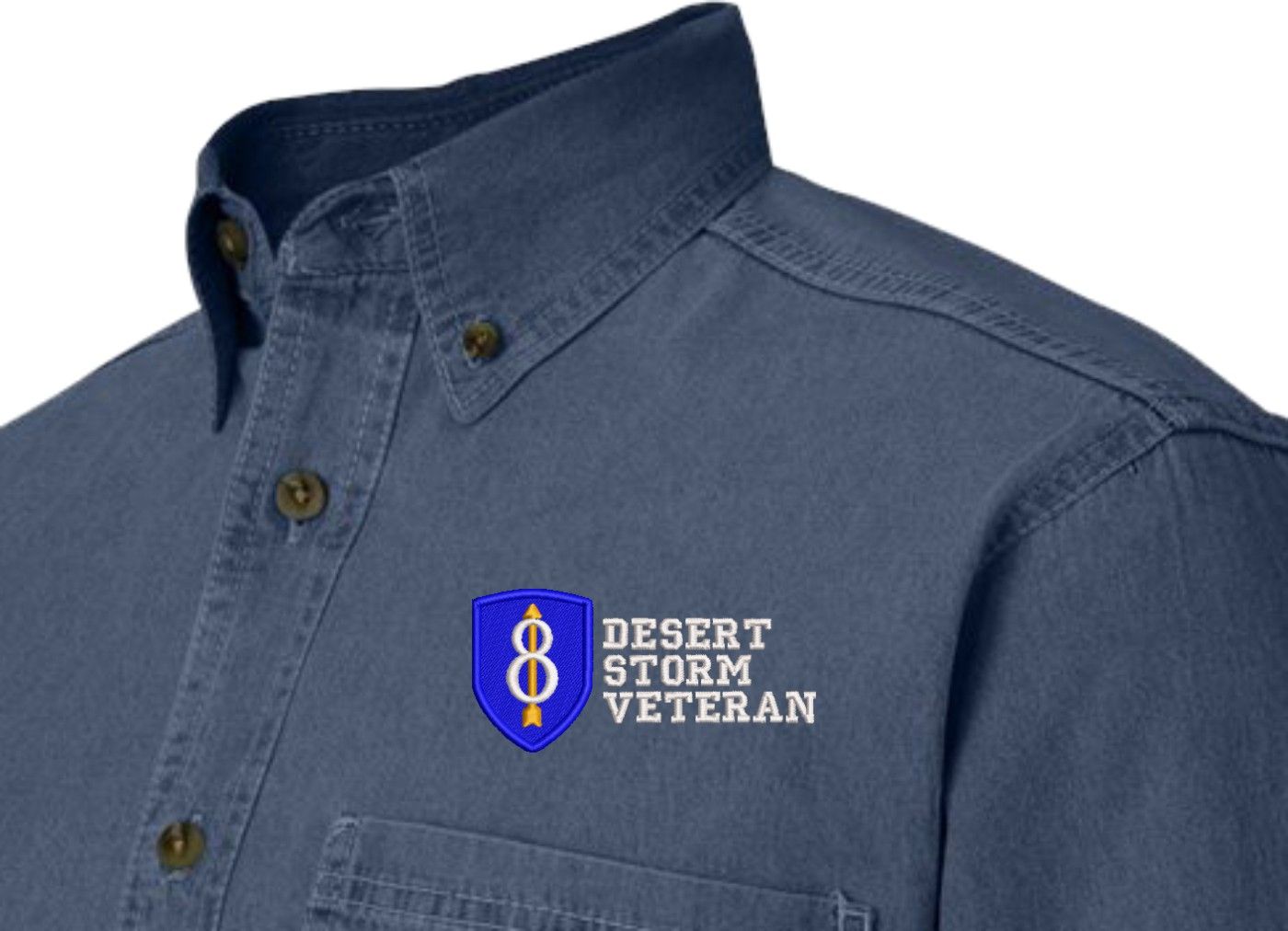 Note: Some of the Color Options pictured may not be available. Available Color Options are listed on the drop down menu above.MilitaryBest is proud to offer this quality 8th Infantry Division Desert Storm Veteran Denim Shirt. This long sleeve button down denim shirt is made using a 100% cotton denim material. These quality Military Denim Shirts are proudly embroidered at our facilities in Scottsboro, AL. Support the Army MWR program by purchasing only from Licensed Vendors.