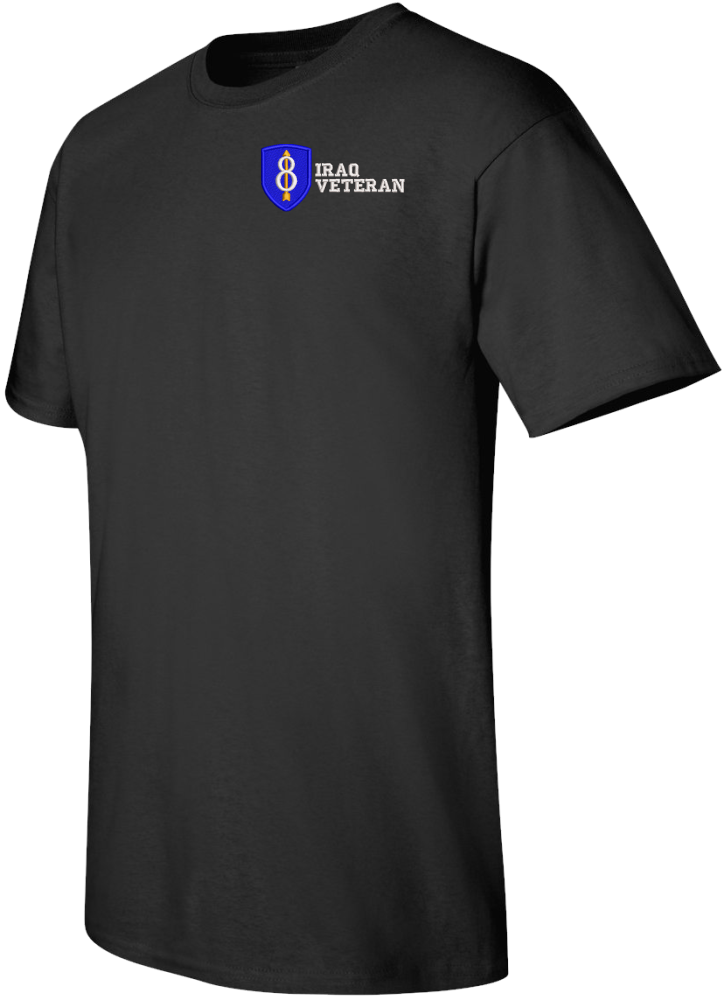 Note: Some of the Color Options pictured may not be available. Available Color Options are listed on the drop down menu above.MilitaryBest is proud to offer this quality 8th Infantry Division Iraq Veteran T Shirt. This Gildan brand short sleeve t-shirt is made using a 6 oz pre-shrunk 100% cotton material. These quality Military T Shirts are proudly embroidered at our facilities in Scottsboro, AL. Support the Army MWR program by purchasing only from Licensed Vendors.