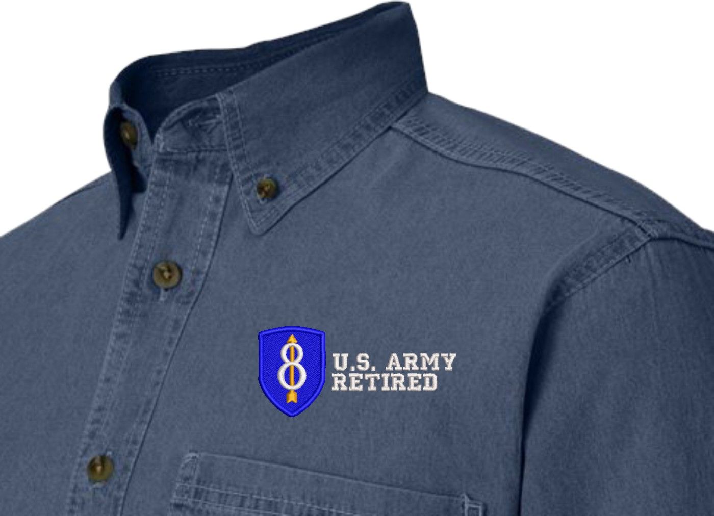 Note: Some of the Color Options pictured may not be available. Available Color Options are listed on the drop down menu above.MilitaryBest is proud to offer this quality 8th Infantry Division Retired Denim Shirt. This long sleeve button down denim shirt is made using a 100% cotton denim material. These quality Military Denim Shirts are proudly embroidered at our facilities in Scottsboro, AL. Support the Army MWR program by purchasing only from Licensed Vendors.