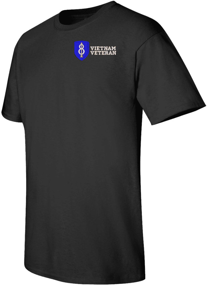 Note: Some of the Color Options pictured may not be available. Available Color Options are listed on the drop down menu above.MilitaryBest is proud to offer this quality 8th Infantry Division Vietnam Veteran T Shirt. This Gildan brand short sleeve t-shirt is made using a 6 oz pre-shrunk 100% cotton material. These quality Military T Shirts are proudly embroidered at our facilities in Scottsboro, AL. Support the Army MWR program by purchasing only from Licensed Vendors.