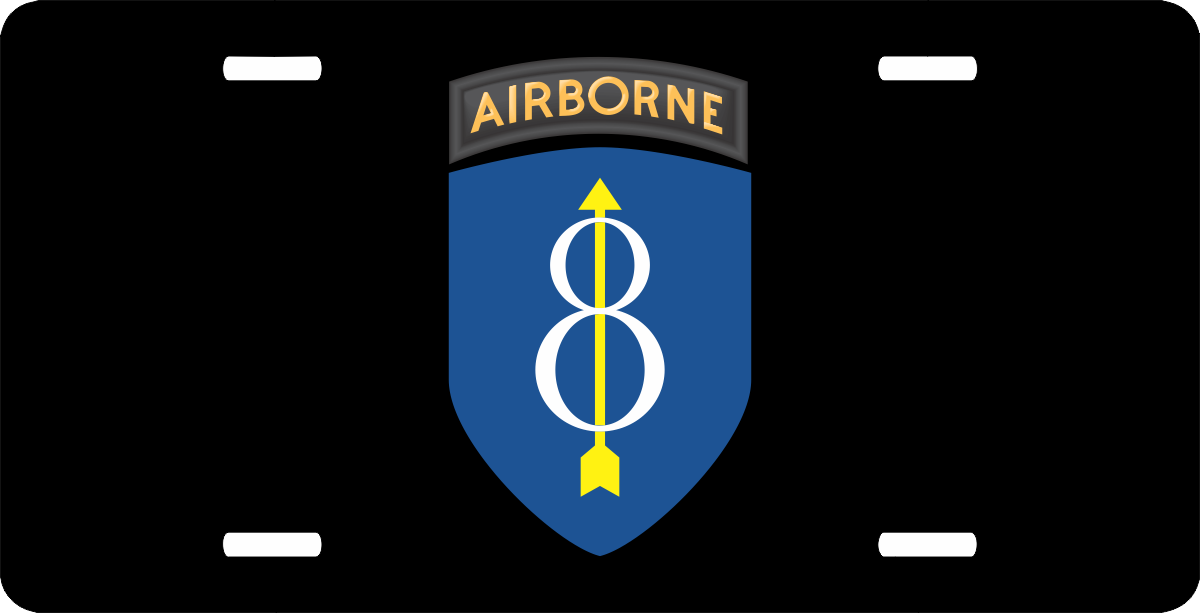 This 8th Infantry with Airborne Tab License Plate is made from heavy gauge aluminum and has a baked enamel finish to last for many years of use. Each plate measures 5 15/16" x 11 15/16". This license plate would make a wonderful addition to your collection or a great gift.
