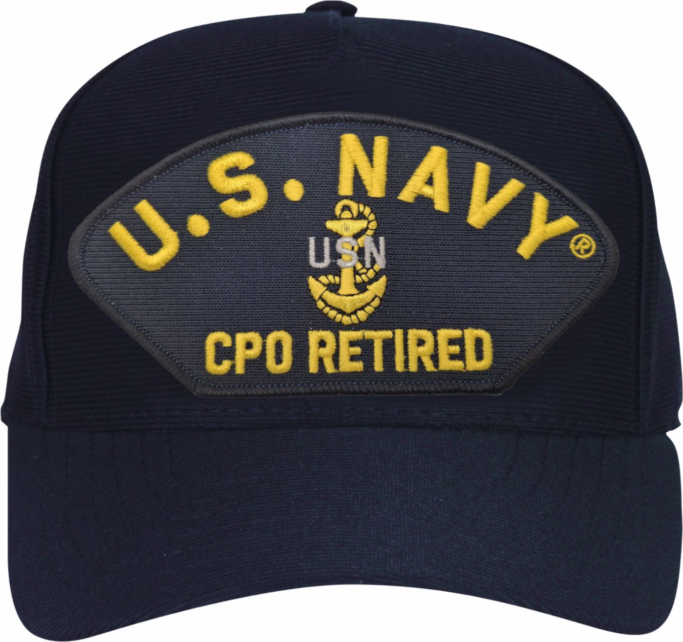 This U.S. Navy CPO Retired with Anchor Ball Cap is an emblematic, poly, dark under the visor cap. Each has an adjustable strap, and is available as a 5 panel high profile or 6 panel low profile cap. All MilitaryBest caps are fully guaranteed. Some people call them Military Covers or Military Hats. This Military Cap is proudly Made in The U.S.A.For caps ordered with custom embroidered personalized text please allow an additional 3 to 5 days production time. All custom back text will be embroidered in ALL CAPITAL LETTERS. Caps with back text or eggs are non-returnable unless there is a material defect in the cap. If a style is not selected the cap will be made using a high profile style cap as pictured.