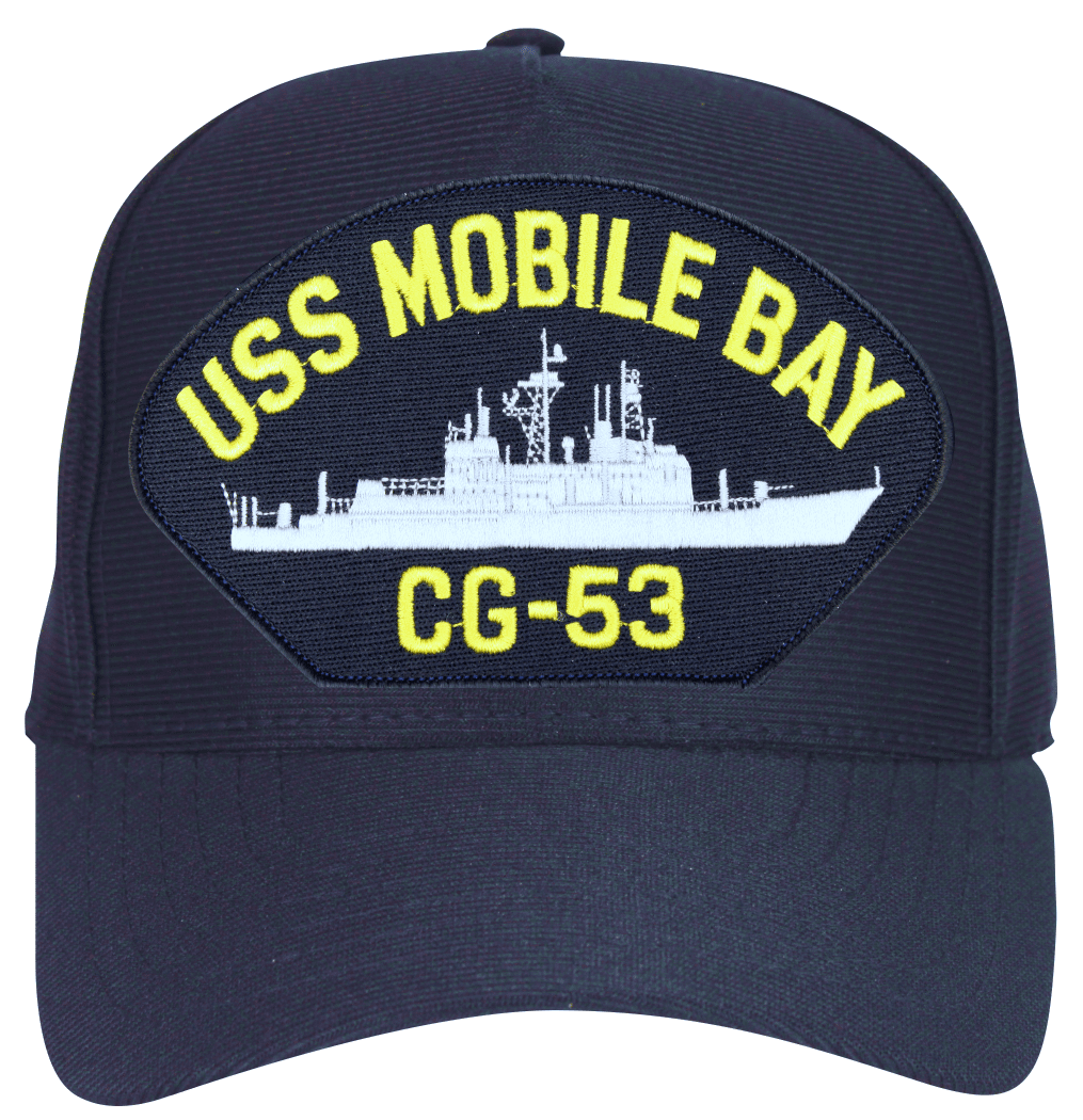This USS Mobile Bay CG-53 Ship Cap is an emblematic, poly, dark under the visor cap. Each has an adjustable strap, and is available as a 5 panel high profile or 6 panel low profile cap. All MilitaryBest caps are fully guaranteed. Some people call them Military Covers or Military Hats. This Military Cap is proudly Made in The U.S.A.For caps ordered with custom embroidered personalized text please allow an additional 3 to 5 days production time. All custom back text will be embroidered in ALL CAPITAL LETTERS. Caps with back text or eggs are non-returnable unless there is a material defect in the cap. If a style is not selected the cap will be made using a high profile style cap as pictured.