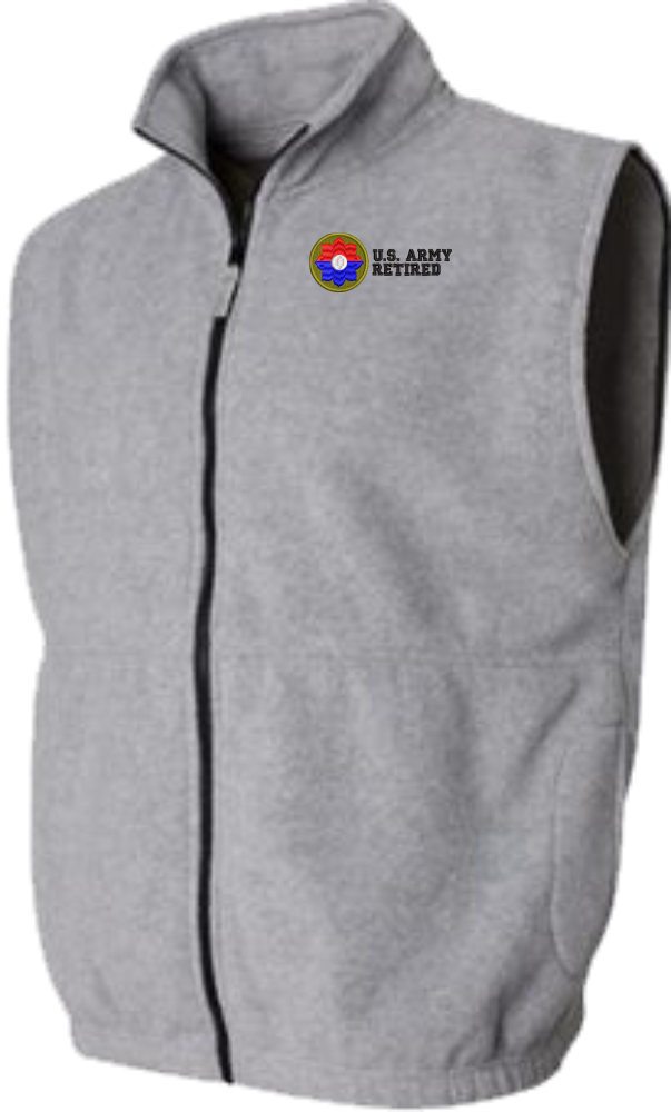 Due to supply chain disruptions, some colors and sizes may not be available in the same Brand, in these cases a brand of comparable quality will be used. Feel free to call in advance of your order, with questions you may have.MilitaryBest is proud to offer this quality 9th Infantry Division Retired Full-Zip Fleece Vest. Our U.S. Army Full Zip Fleece Vest features a convertible collar with dyed-to-match zipper pull and oversized nylon reinforced slash pockets. These Military Vests are proudly embroidered at our facilities in Scottsboro, AL.