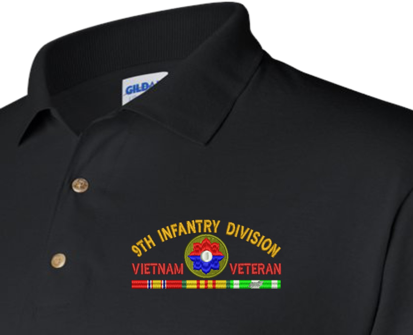 MilitaryBest is proud to offer this quality U.S. Army 9th Infantry Division Vietnam Veteran with Ribbons Embroidered Polo. Each Polo is available in either 100% Ringspun cotton pique or a 50/50 cotton/polyester blend. These quality Military Polos are proudly embroidered at our facilities in Scottsboro, AL. Support the Army MWR program by purchasing only from Licensed Vendors. To all of our Vietnam Veterans, Welcome Home!