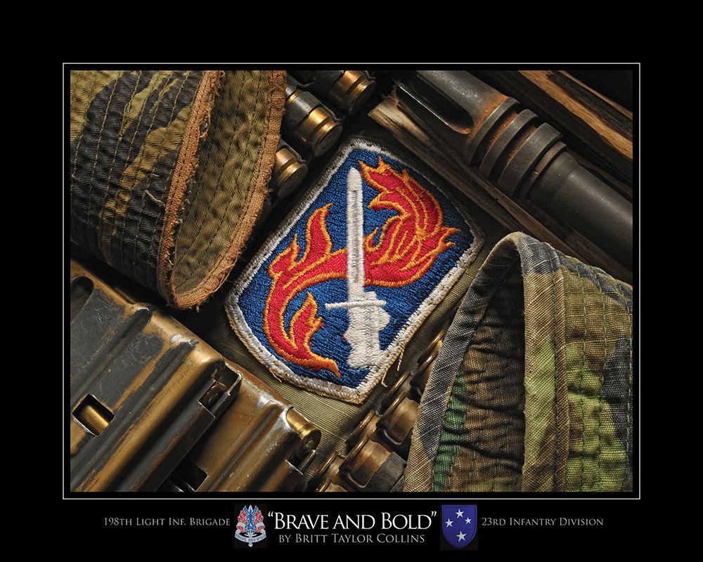 TO FULLY APPRECIATE THE DETAIL IN THIS PIECE, PLEASE CLICK ON THE IMAGE ABOVE TO ENLARGE.We are extremely proud and honored to have partnered with Britt Taylor Collins, “The Veterans’ Artist”, to offer an extensive line of Military Art, particularly these incredible Giclee LenzPrints. This 198th Light Infantray Brigade "Brave and Bold" Military Art Piece is printed with Archival Fade Resistant inks on high quality Museum Grade paper. Each U.S. Army art piece is printed one at a time and inspected by the artist, Britt Taylor Collins. After inspection this piece is signed by Britt himself.