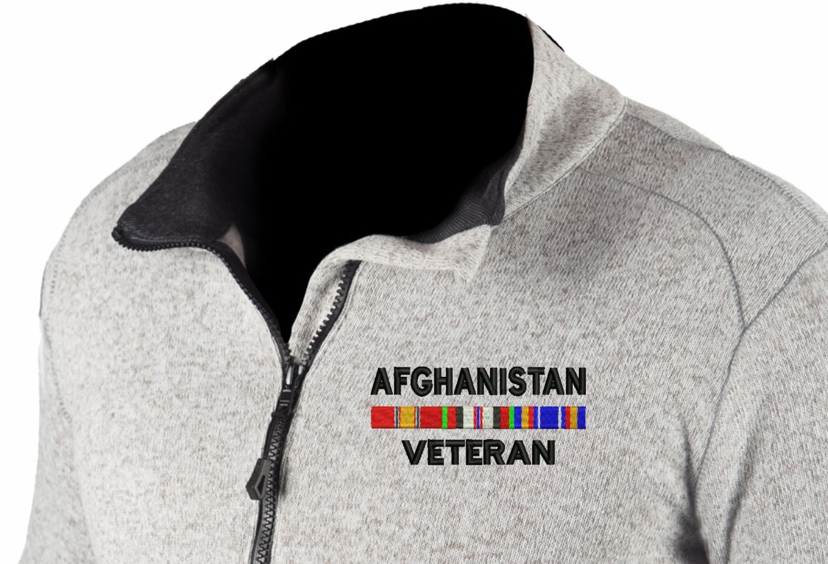 Striving to provide you with the highest quality apparel made in the United States, MilitaryBest is proud to offer this Afghanistan Veteran with Service Ribbons Knit HEATR Long Sleeve Full Zip. Manufactured by WSI Sportswear in Minnesota and Embroidered by us here at MilitaryBest in Alabama; this shirt is 100% Made in the USA! We aim to provide you with soft, comfortable, dry-fit, American-made clothing that allows you to be your best. HEATR is a high-tech material developed by WSI that helps keep you up to 40% warmer than other materials on the market. Fibers that are integrated within the fabric expand and heat up as they come into contact with the skin. Since the fibers are integrated in the fabric, they will not wash out. *For washing we recommend machine wash cold with like colors, and line dry.PRODUCT FEATURES