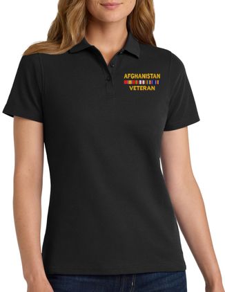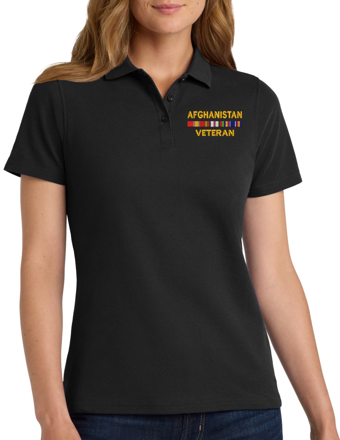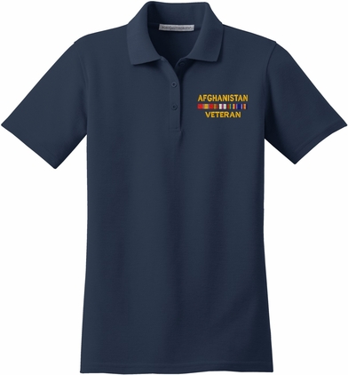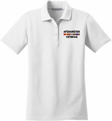 MilitaryBest is proud to offer this Afghanistan Veteran with Service Ribbons Women's Stain-Release Polo. This polo is embroidered by our MilitaryBest team in Northeast Alabama. These polos are made with a stain-release finish for long-lasting wear, odor-fighting properties, and superior wrinkle and shrink resistance.Care Instructions: Machine Wash Cold With Like Colors. Do Not Use Fabric Softener. Do Not Bleach. Tumble Dry Low. Warm Iron If Necessary.