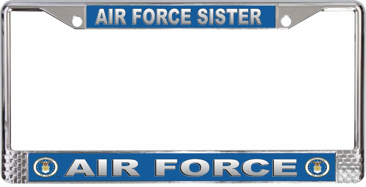 This 'Air Force Sister' License Plate Frame is made from the highest quality finished metal alloy. Each one is designed to provide years of use. Each is designed in our facility in Scottsboro, Alabama. Please check your state and local regulations for compatibility of these frames for use on your vehicle.