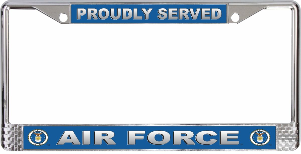 This Air Force 'Proudly Served' License Plate Frame is made from the highest quality finished metal alloy. Each one is designed to provide years of use. Each is designed in our facility in Scottsboro, Alabama. Please check your state and local regulations for compatibility of these frames for use on your vehicle.
