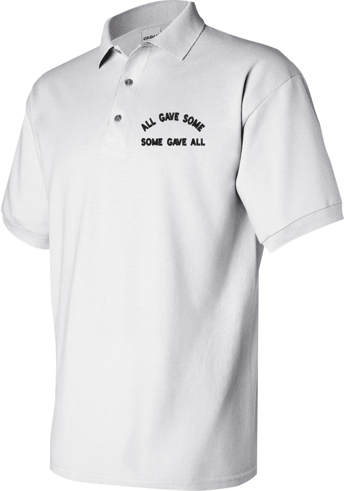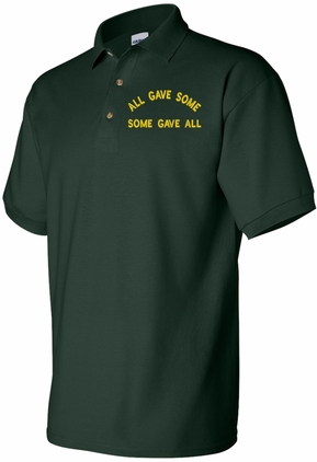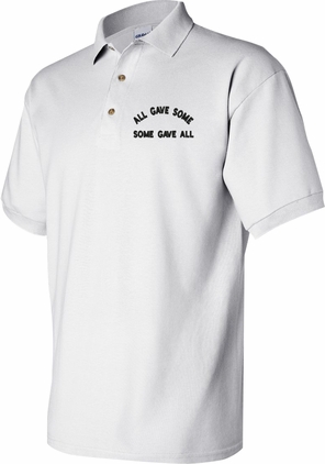 Note: Some of the Color Options pictured may not be available. Available Color Options are listed on the drop down menu above.MilitaryBest is proud to offer this quality All Gave Some, Some Gave All Text-Only Polo. Each Polo is available in either 100% Ringspun cotton pique or a 50/50 cotton/polyester blend. These quality Military Polos are proudly embroidered at our facilities in Scottsboro, AL. Support the Army MWR program by purchasing only from Licensed Vendors.