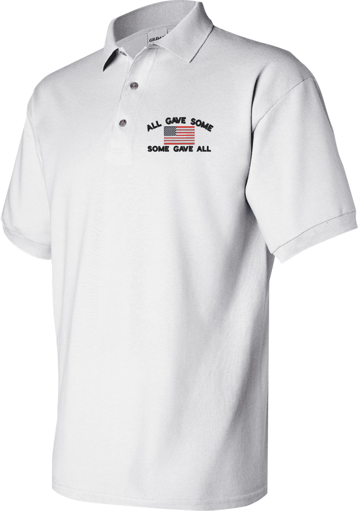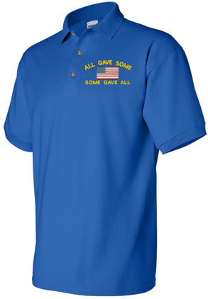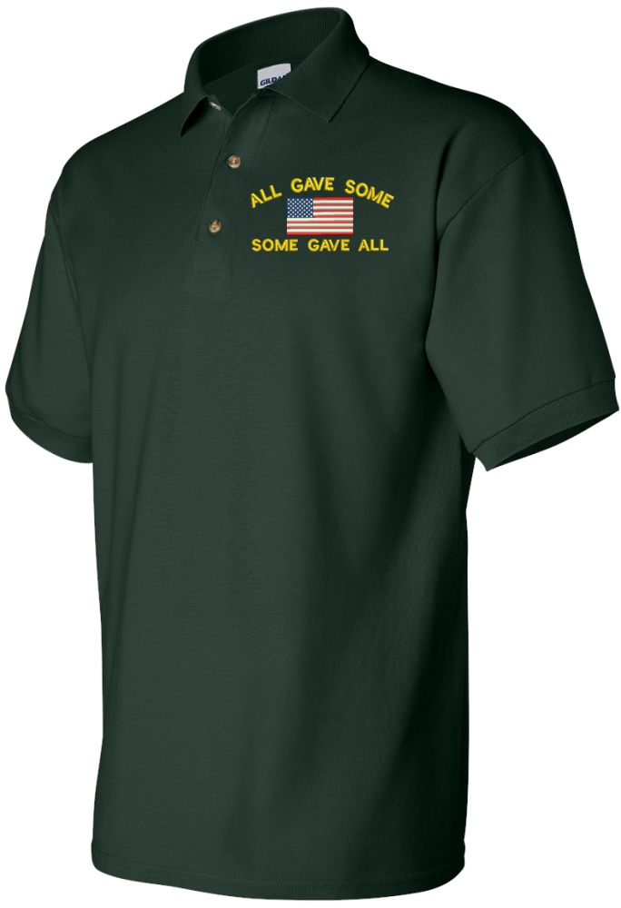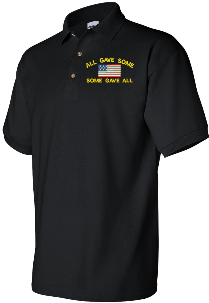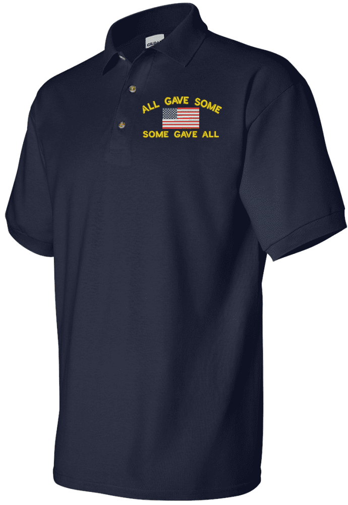Note: Some of the Color Options pictured may not be available. Available Color Options are listed on the drop down menu above.MilitaryBest is proud to offer this quality All Gave Some, Some Gave All with American Flag Polo. Each Polo is available in either 100% Ringspun cotton pique or a 50/50 cotton/polyester blend. These quality Military Polos are proudly embroidered at our facilities in Scottsboro, AL. Support the Army MWR program by purchasing only from Licensed Vendors.