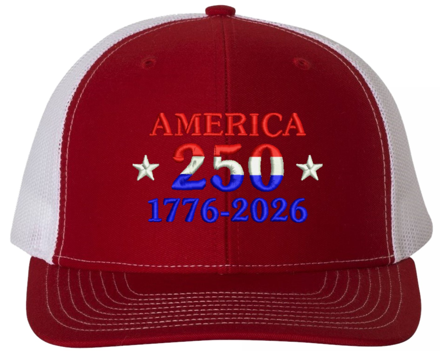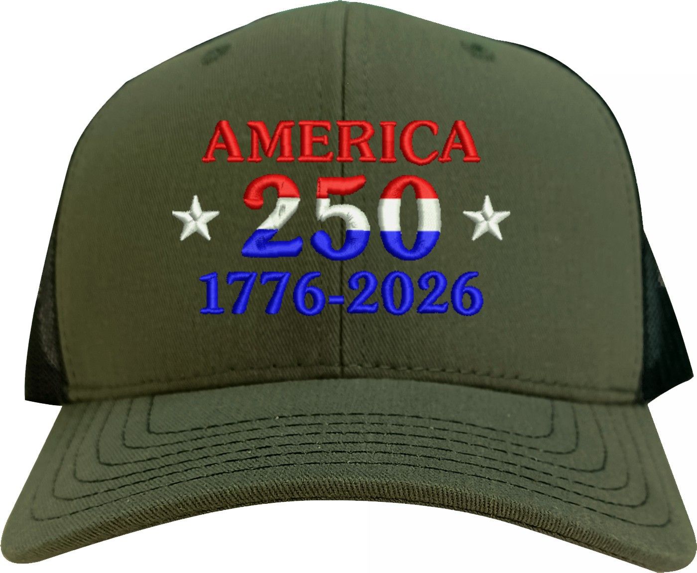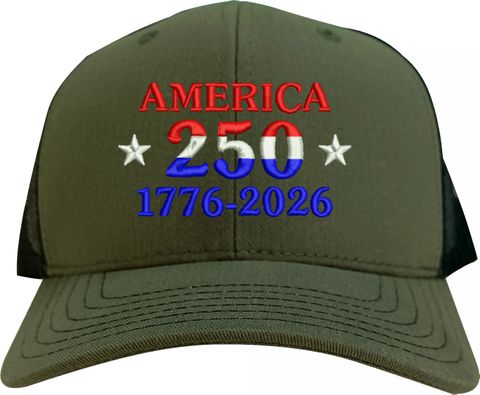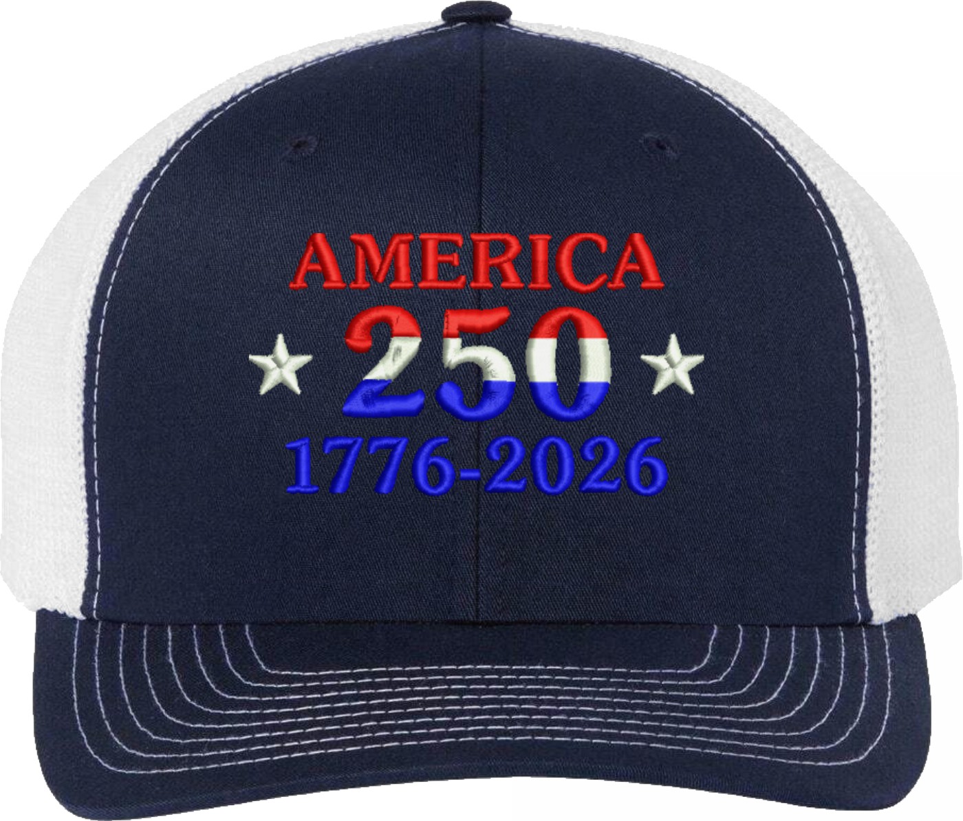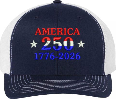 Celebrate 250 Years of the United States of America! MilitaryBest is proud to offer this America 250 Embroidered Mesh-Back Cap. This Mesh-Back Cap is expertly crafted by our skilled embroidery technicians at our facilities in Scottsboro, Alabama. As with all MilitaryBest items, your satisfaction is guaranteed!For caps ordered with custom embroidered personalized text please allow an additional 3 to 5 days production time. All custom back text will be embroidered in ALL CAPITAL LETTERS. Caps with back text or eggs are non-returnable unless there is a material defect in the cap.