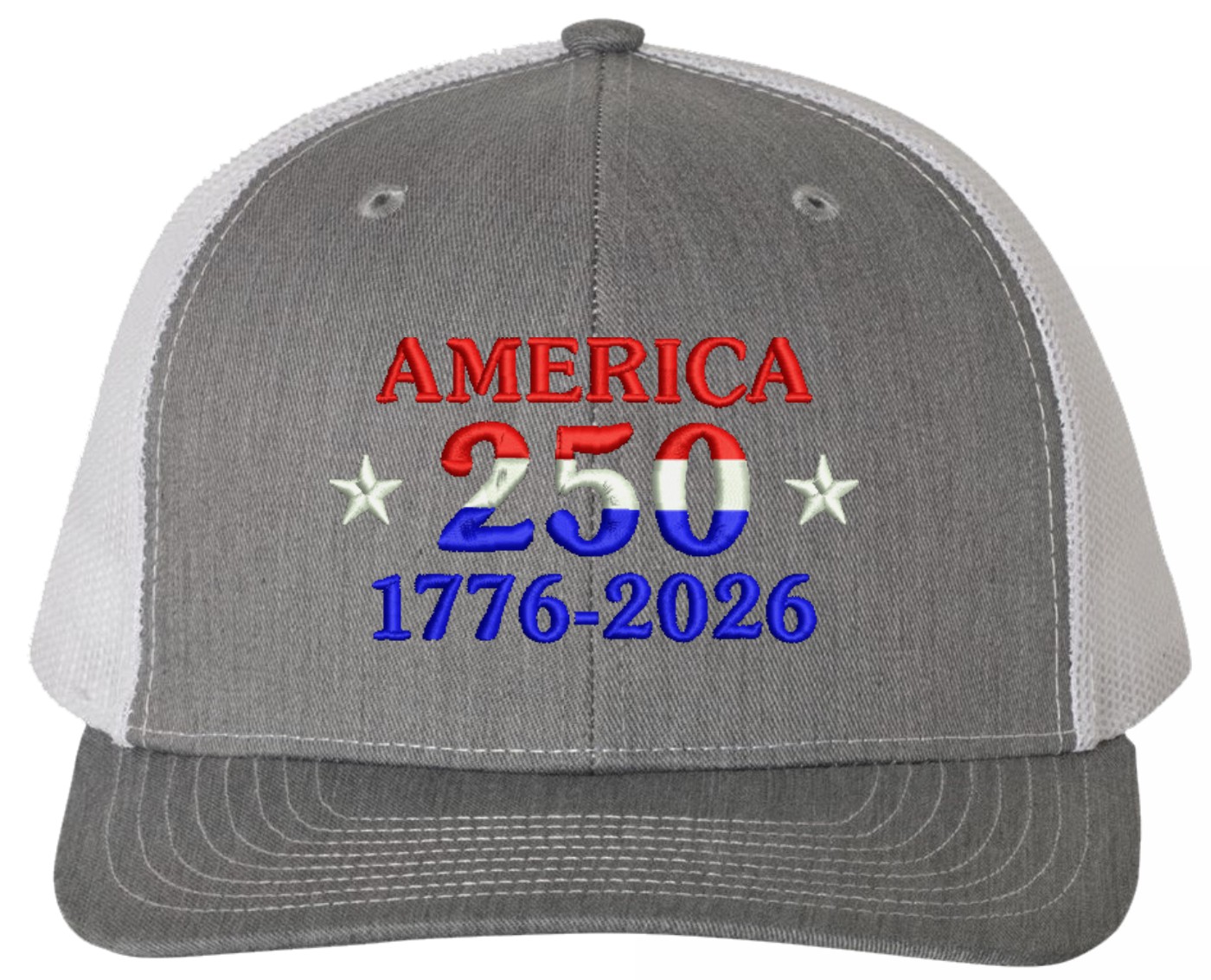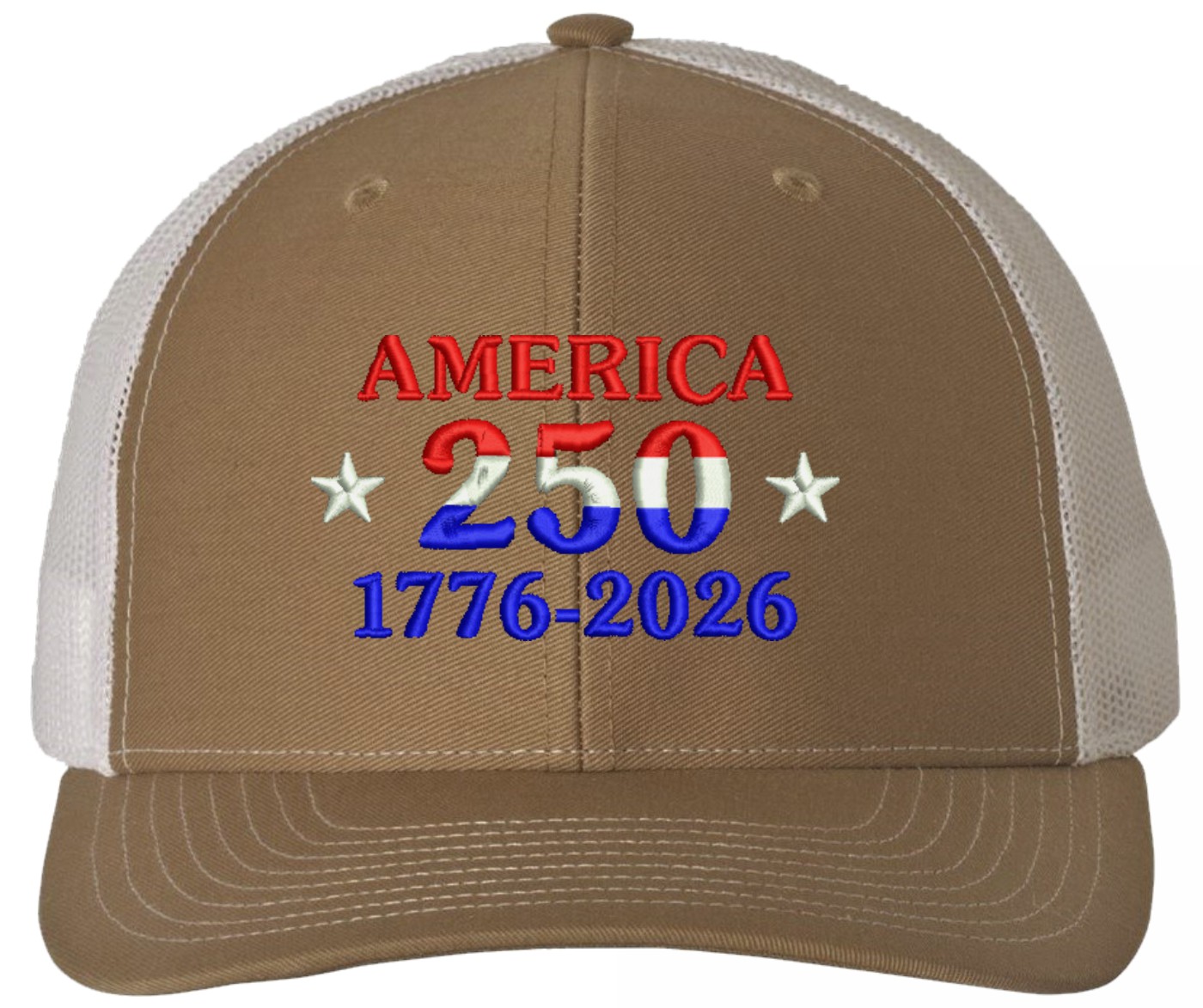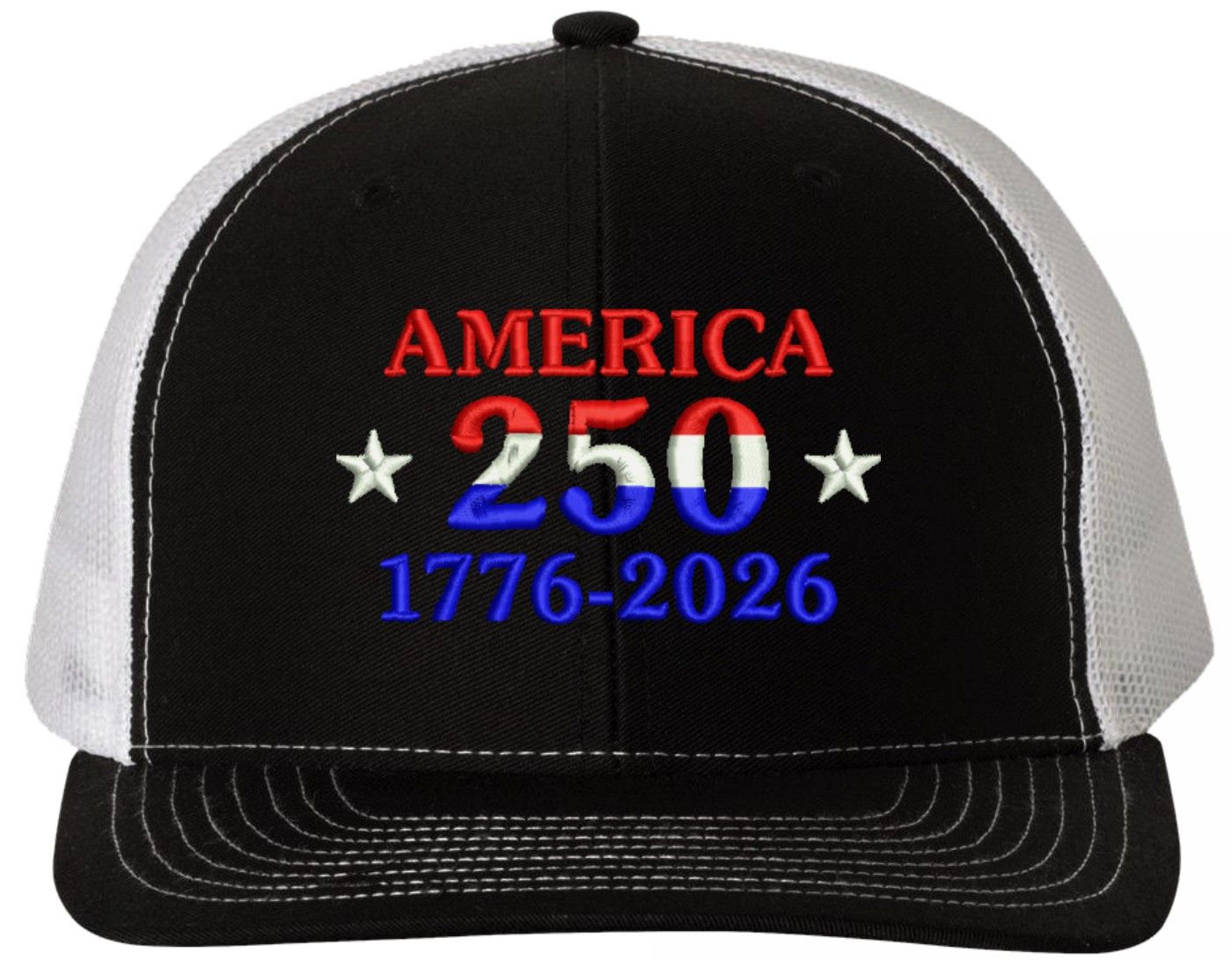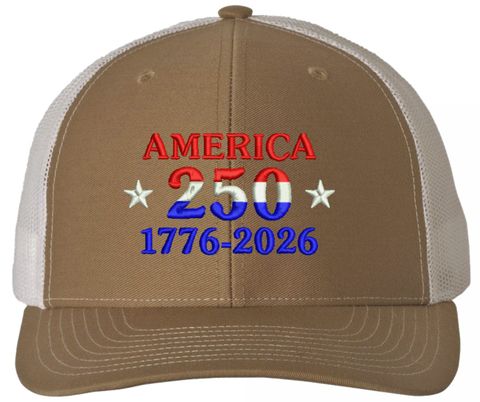 Celebrate 250 Years of the United States of America! MilitaryBest is proud to offer this America 250 Embroidered Mesh-Back Cap. This Mesh-Back Cap is expertly crafted by our skilled embroidery technicians at our facilities in Scottsboro, Alabama. As with all MilitaryBest items, your satisfaction is guaranteed!For caps ordered with custom embroidered personalized text please allow an additional 3 to 5 days production time. All custom back text will be embroidered in ALL CAPITAL LETTERS. Caps with back text or eggs are non-returnable unless there is a material defect in the cap.