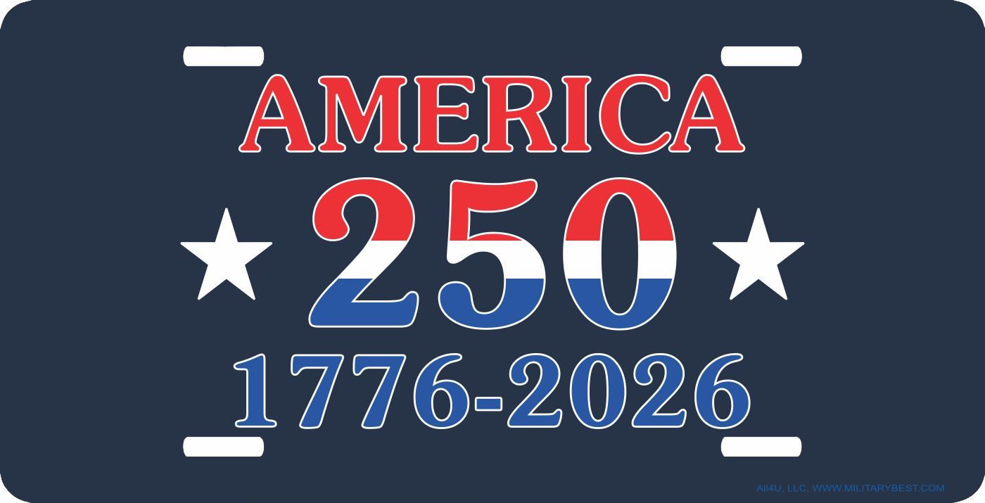 This America 250 License Plate is made from heavy gauge aluminum and has a baked enamel finish to last for many years of use. Each plate measures 5 15/16" x 11 15/16". This license plate would make a wonderful addition to your collection or a great gift.