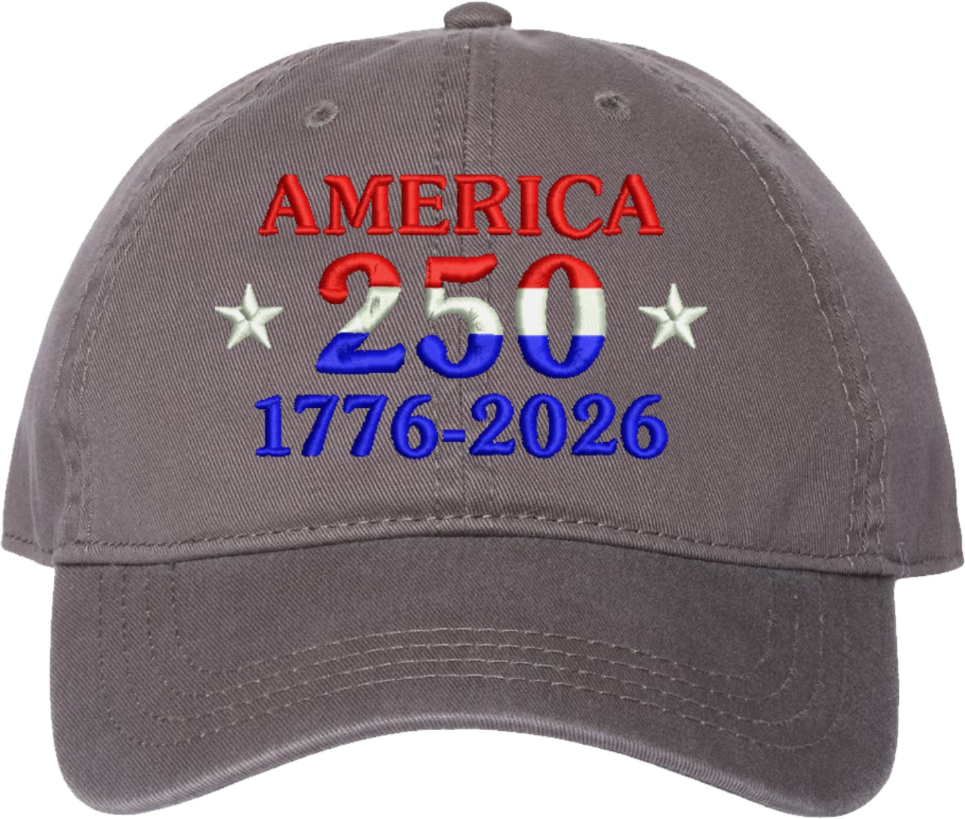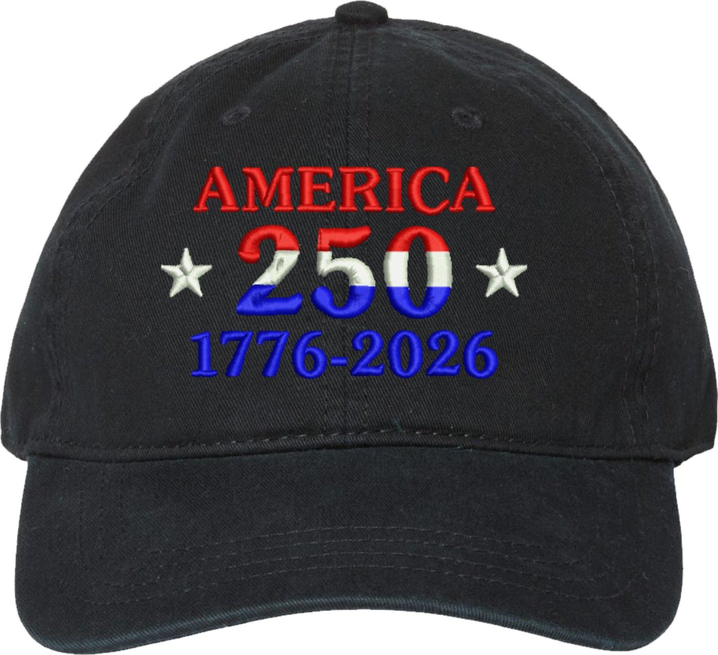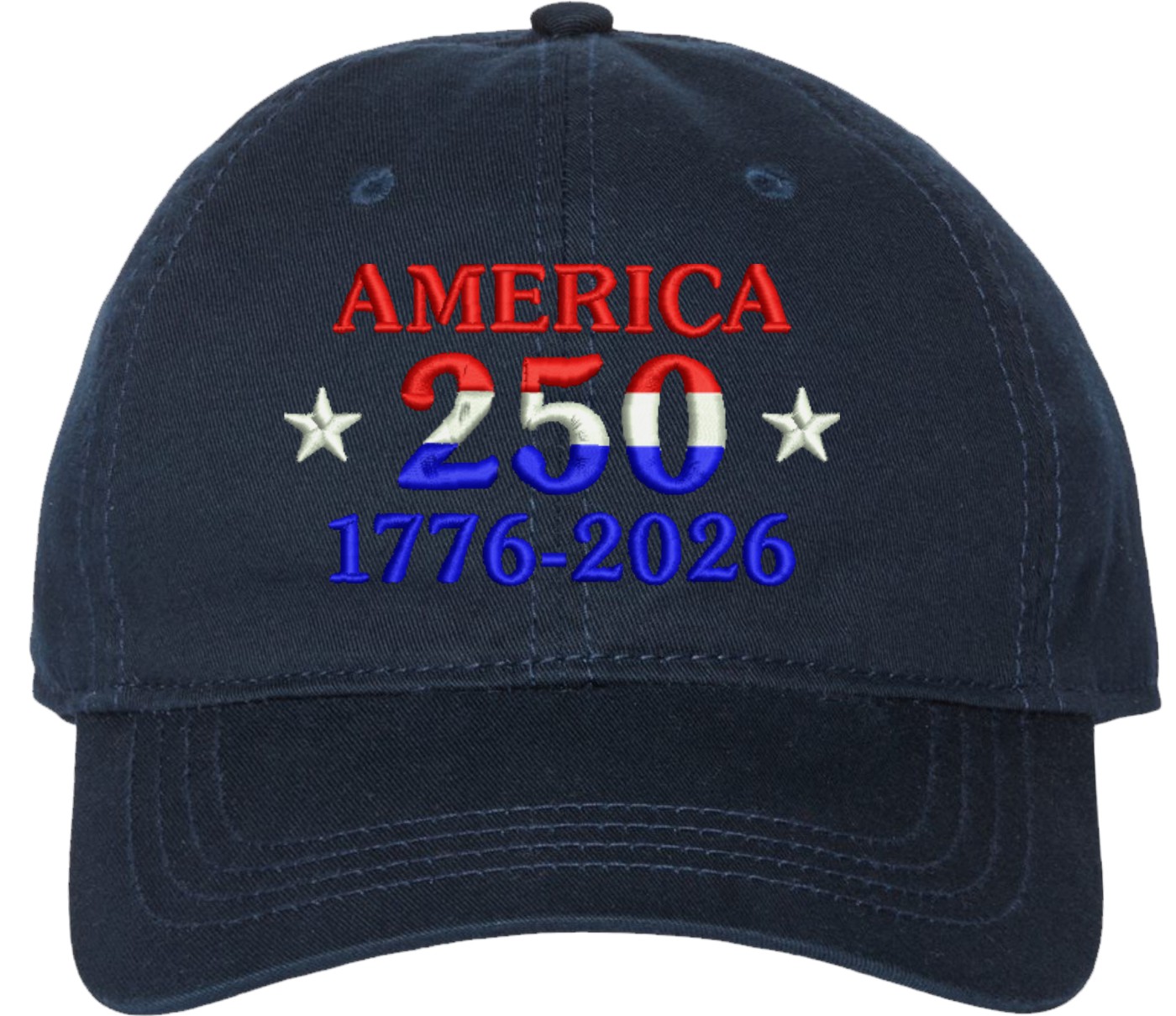 Celebrate 250 years of the United States of America! Show your pride with this America 250 Unstructured Dad Cap from MilitaryBest. Crafted from 100% washed chino twill cotton, this six-panel, low-profile cap offers a relaxed and comfortable fit. Featuring high-quality embroidery done in our Scottsboro, Alabama facility, this cap is designed with a pre-curved visor and an adjustable tri-glide buckle closure for a perfect fit. Whether for everyday wear or as a meaningful gift, this cap is a great way to honor your own or a loved one's service.For caps ordered with custom embroidered personalized text please allow an additional 3 to 5 days production time. All custom back text will be embroidered in ALL CAPITAL LETTERS. Caps with back text or eggs are non-returnable unless there is a material defect in the cap.