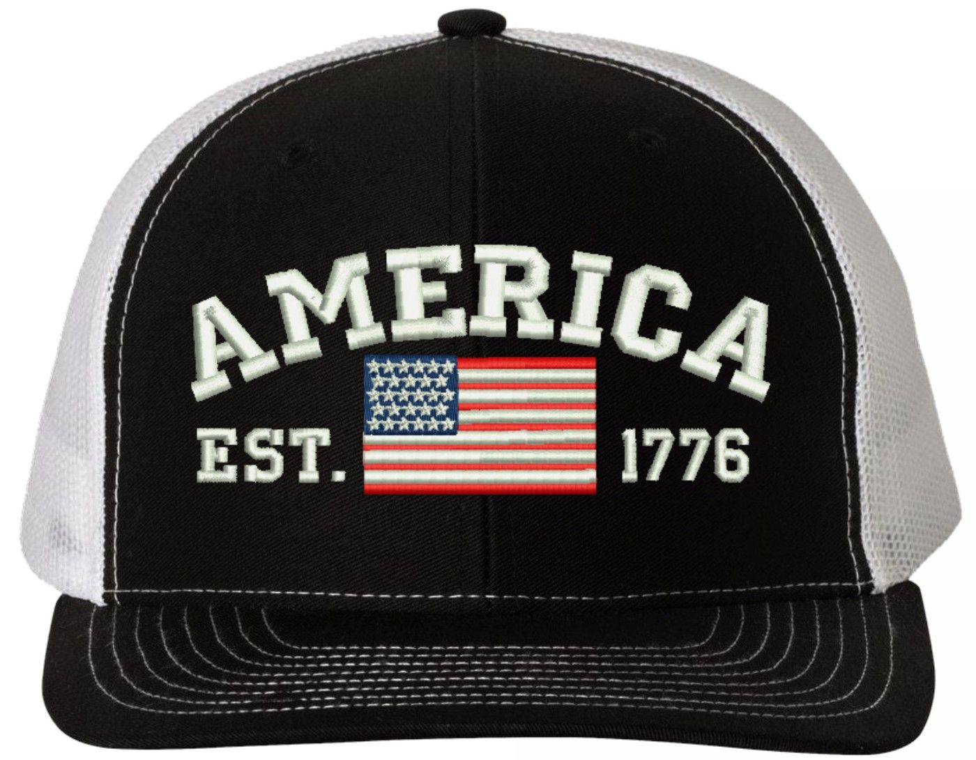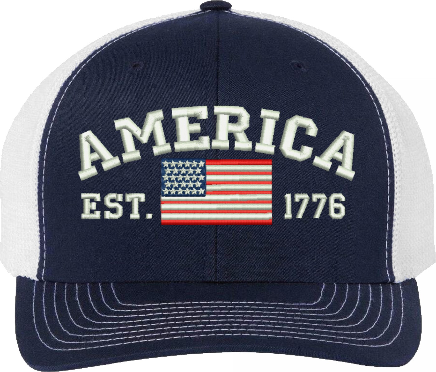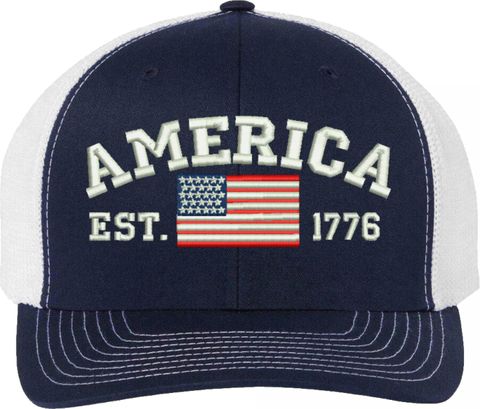 Celebrate 250 Years of the United States of America! MilitaryBest is proud to offer this America Est 1776 Embroidered Mesh-Back Cap. This Mesh-Back Cap is expertly crafted by our skilled embroidery technicians at our facilities in Scottsboro, Alabama. As with all MilitaryBest items, your satisfaction is guaranteed!For caps ordered with custom embroidered personalized text please allow an additional 3 to 5 days production time. All custom back text will be embroidered in ALL CAPITAL LETTERS. Caps with back text or eggs are non-returnable unless there is a material defect in the cap.