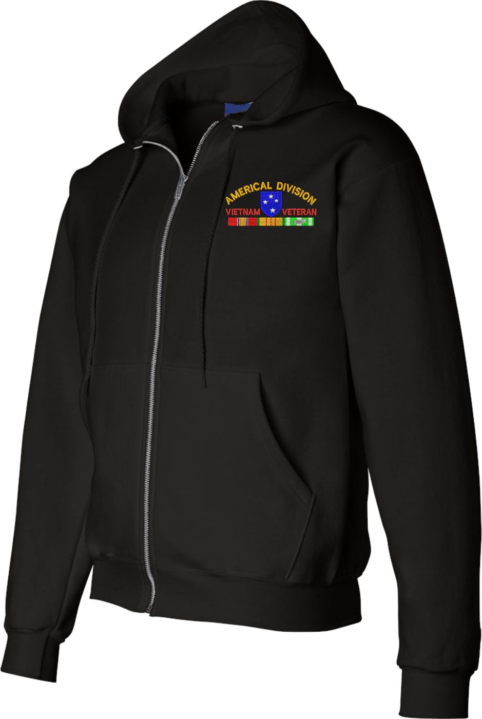MilitaryBest has expanded its line of apparel with this custom embroidered U.S. Army Americal Division Vietnam Veteran with Ribbons Embroidered Zippered Hoodie. Each Hoodie is direct embroidered onto a Champion brand 9.5 oz 50/50 Cotton Poly blend. This will make an excellent addition to your wardrobe, or a great gift. Your satisfaction is Guaranteed! These quality zippered hoodies are proudly embroidered at our facilities in Scottsboro, AL. Support the Army MWR program by purchasing only from Licensed Vendors. To all of our Vietnam Veterans, Welcome Home!