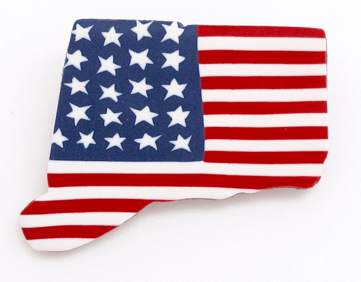MilitaryBest is proud to have partnered with Merrily Made to offer this patriotic American flag Americana Connecticut State Shaped Pin. Each pin is handmade in the USA and measures 1x1.5 inches.Merrie’s Americana line has found its inspiration in her New England childhood, with its white picket fences and clear starry nights. Her crisp red, white, and blue designs capture the essence of the American flags that grace the town commons. Brimming with the spirit of dedication for which Merrily Made’s has become known, each piece continues to be individually handmade in the USA. The Americana designs involve the caneworking process of building layers of polymers and assembling pieces in a variety of colors and shapes.