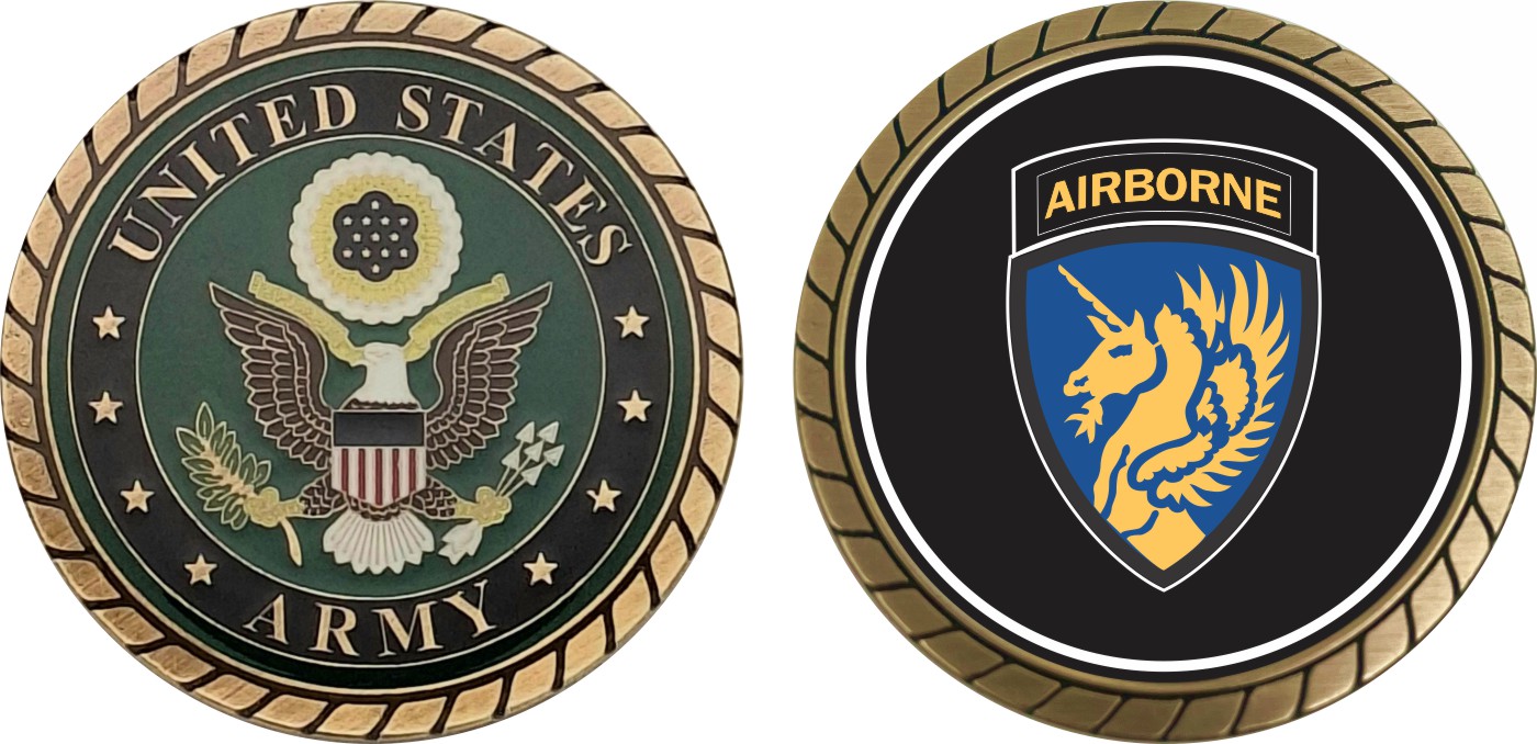 This 1 3/4” Army 13th Airborne Division Challenge Coin is proudly offered by Militarybest. This Officially Licensed Army coin has beautiful enamel finish on one side and an organized crisp clean design on the opposite side.