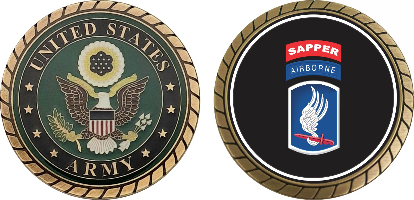 This 1 3/4” Army 173rd Airborne Brigade with Sapper Tab Challenge Coin is proudly offered by Militarybest. This Officially Licensed Army coin has beautiful enamel finish on one side and an organized crisp clean design on the opposite side.