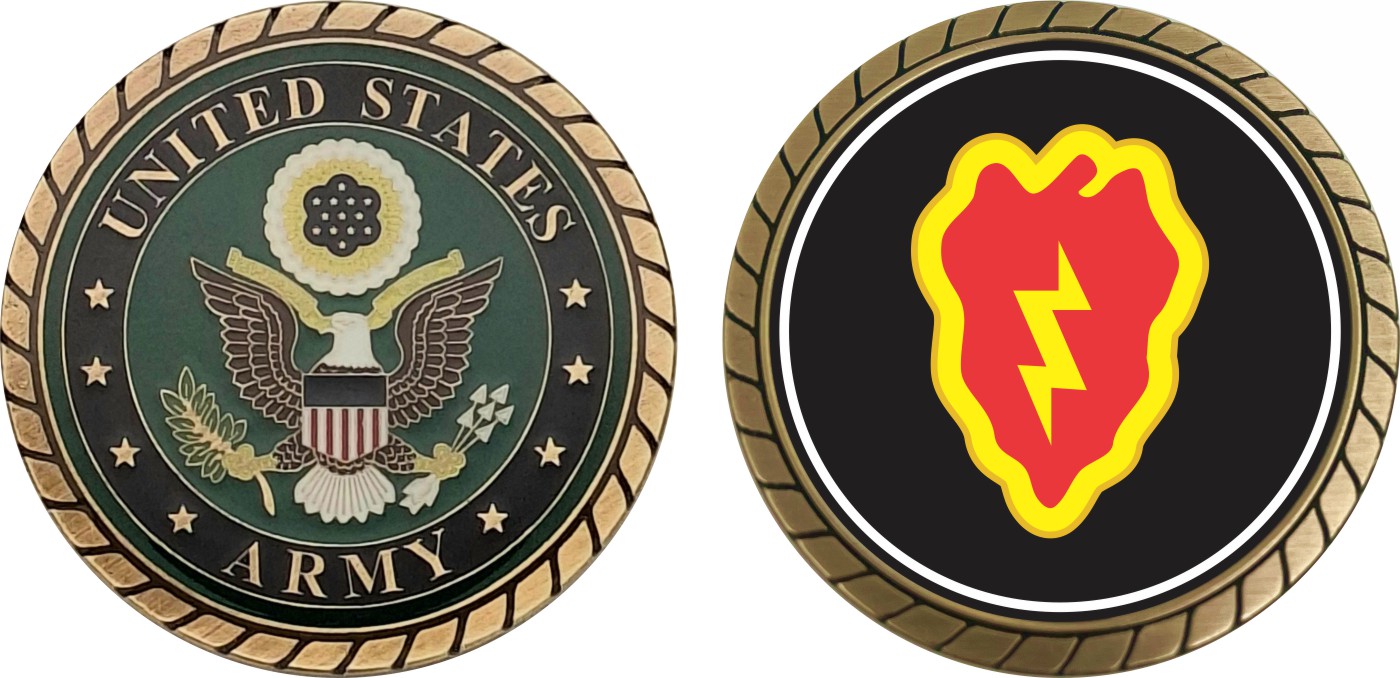 This 1 3/4” Army 25th Infantry Division Challenge Coin is proudly offered by Militarybest. This Officially Licensed Army coin has beautiful enamel finish on one side and an organized crisp clean design on the opposite side.