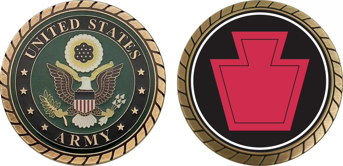 This 1 3/4” Army 28th Infantry Division Challenge Coin is proudly offered by Militarybest. This Officially Licensed Army coin has beautiful enamel finish on one side and an organized crisp clean design on the opposite side.