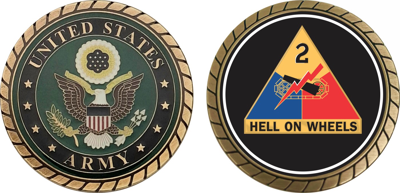 This 1 3/4” Army 2nd Armored Division Unit Crest Challenge Coin is proudly offered by Militarybest. This Officially Licensed Army coin has beautiful enamel finish on one side and an organized crisp clean design on the opposite side.