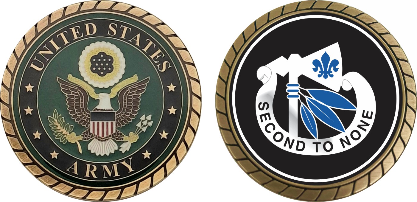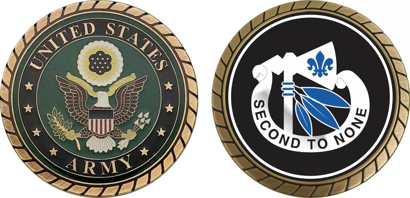 This 1 3/4” Army 2nd Infantry Division Unit Crest Challenge Coin is proudly offered by Militarybest. This Officially Licensed Army coin has beautiful enamel finish on one side and an organized crisp clean design on the opposite side.