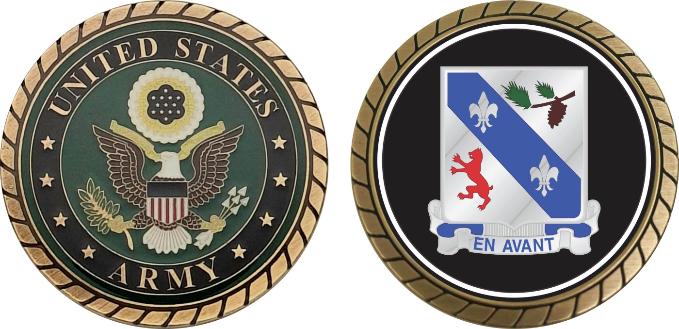 This 1 3/4” Army 321st Regiment Unit Crest Challenge Coin is proudly offered by Militarybest. This Officially Licensed Army coin has beautiful enamel finish on one side and an organized crisp clean design on the opposite side.
