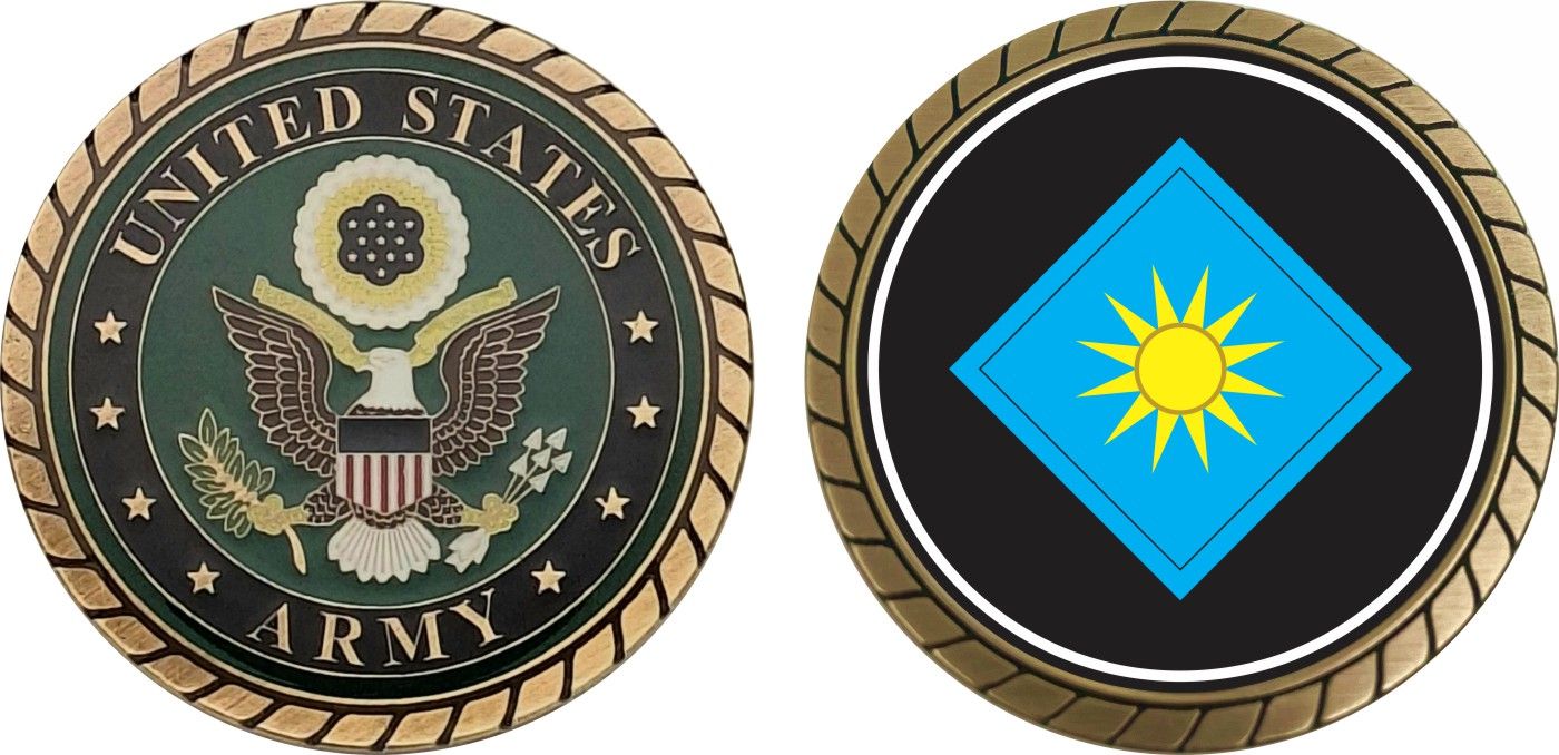 This 1 3/4” Army 40th Infantry Division Challenge Coin is proudly offered by Militarybest. This Officially Licensed Army coin has beautiful enamel finish on one side and an organized crisp clean design on the opposite side.