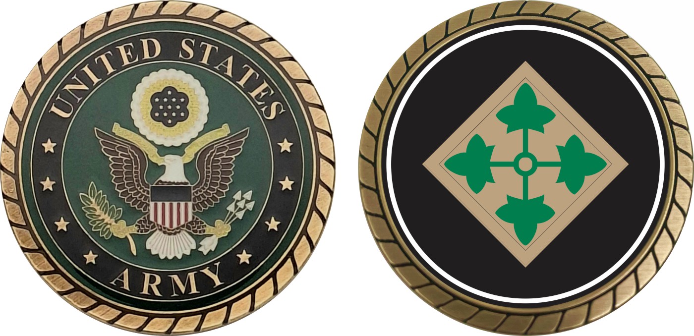 This 1 3/4” Army 4th Infantry Division Challenge Coin is proudly offered by Militarybest. This Officially Licensed Army coin has beautiful enamel finish on one side and an organized crisp clean design on the opposite side.