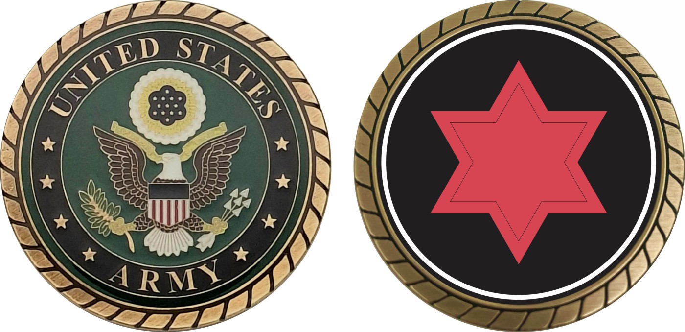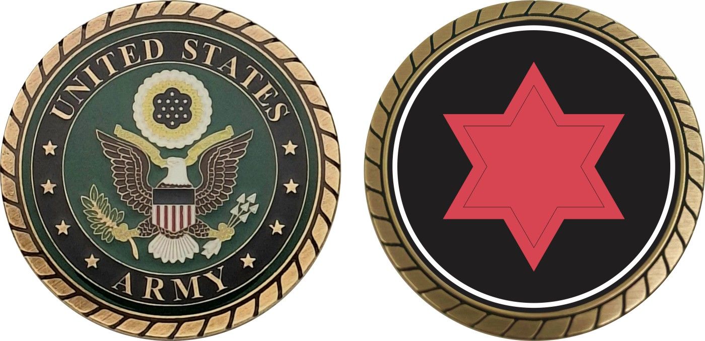 This 1 3/4” Army 6th Infantry Division Challenge Coin is proudly offered by Militarybest. This Officially Licensed Army coin has beautiful enamel finish on one side and an organized crisp clean design on the opposite side.