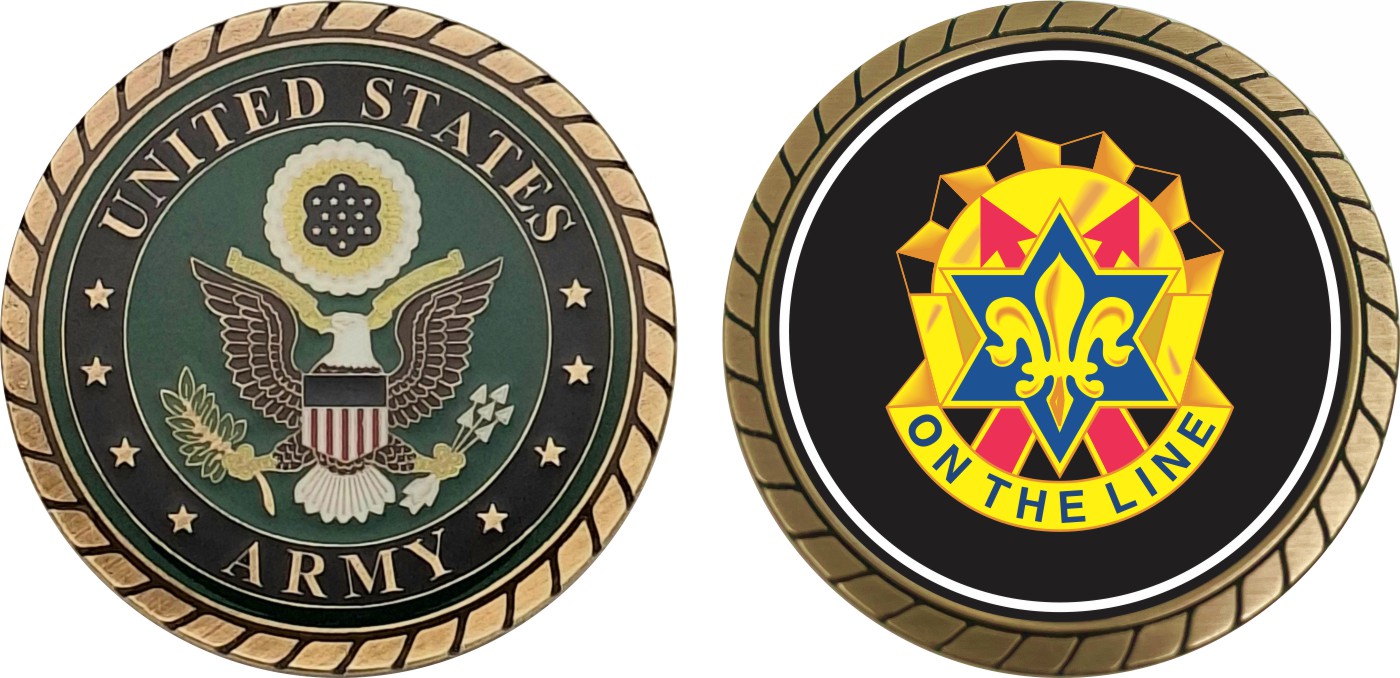 This 1 3/4” Army 6th Infantry Division Unit Crest Challenge Coin is proudly offered by Militarybest. This Officially Licensed Army coin has beautiful enamel finish on one side and an organized crisp clean design on the opposite side.