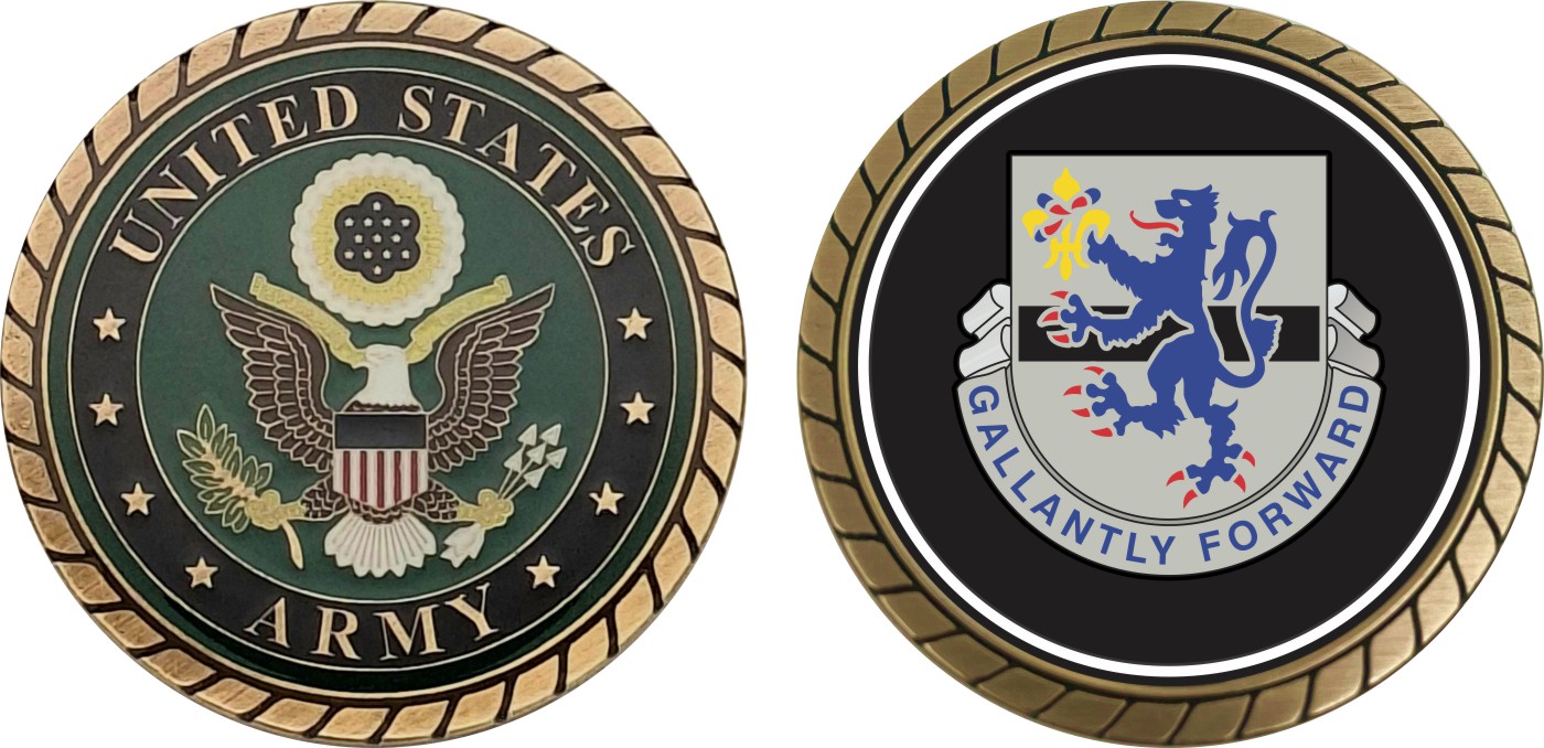 This 1 3/4” Army 71st Cavalry Regiment Challenge Coin is proudly offered by Militarybest. This Officially Licensed Army coin has beautiful enamel finish on one side and an organized crisp clean design on the opposite side.