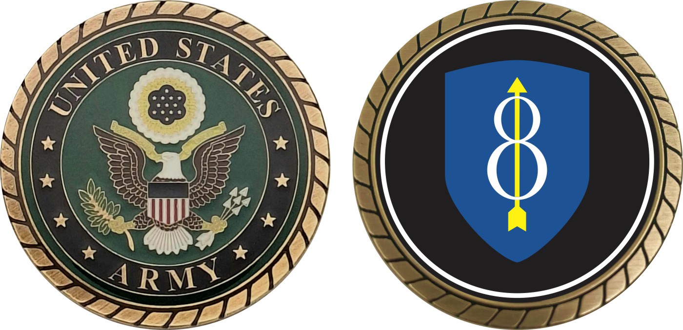 This 1 3/4” Army 8th Infantry Division Challenge Coin is proudly offered by Militarybest. This Officially Licensed Army coin has beautiful enamel finish on one side and an organized crisp clean design on the opposite side.
