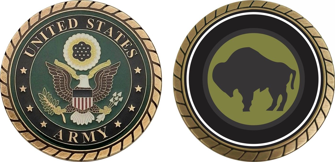 This 1 3/4” Army 92nd Infantry Division Challenge Coin is proudly offered by Militarybest. This Officially Licensed Army coin has beautiful enamel finish on one side and an organized crisp clean design on the opposite side.