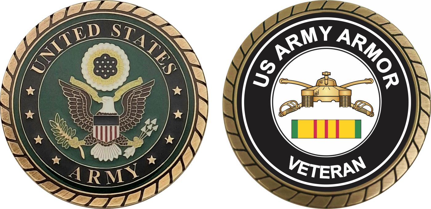 This 1 3/4” Army Armor Corps Vietnam Veteran Challenge Coin is proudly offered by MilitaryBest. This Officially Licensed Army coin has beautiful enamel finish on one side and an organized crisp clean Army Armor Corps Vietnam Veteran design on the opposite side.