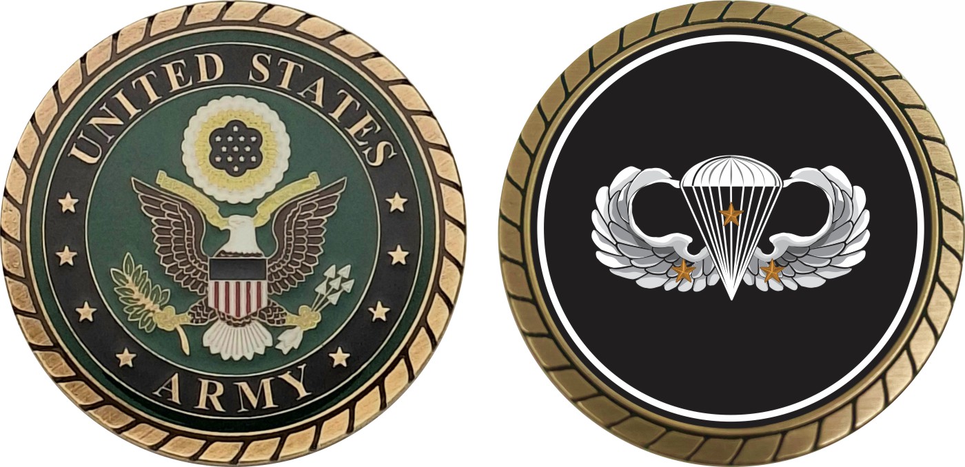 This 1 3/4” Army Basic 3 Combat Jump Wings Challenge Coin is proudly offered by Militarybest. This Officially Licensed Army coin has beautiful enamel finish on one side and an organized crisp clean design on the opposite side.
