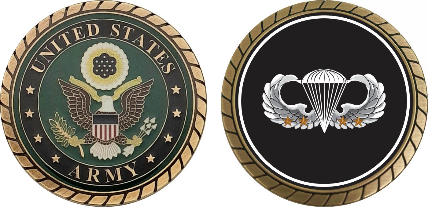 This 1 3/4” Army Basic 4 Combat Jump Wings Challenge Coin is proudly offered by Militarybest. This Officially Licensed Army coin has beautiful enamel finish on one side and an organized crisp clean design on the opposite side.
