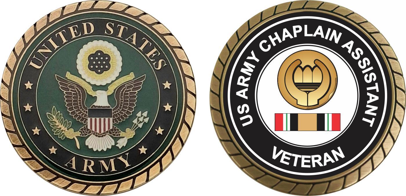 This 1 3/4” Army Chaplain Assistant Iraq Veteran Challenge Coin is proudly offered by MilitaryBest. This Officially Licensed Army coin has beautiful enamel finish on one side and an organized crisp clean Army Chaplain Assistant Iraq Veteran design on the opposite side.