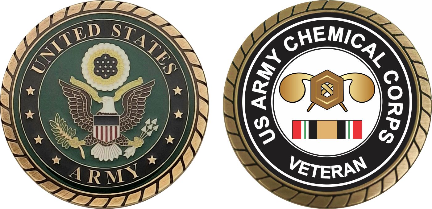 This 1 3/4” Army Chemical Corps Iraq Veteran Challenge Coin is proudly offered by MilitaryBest. This Officially Licensed Army coin has beautiful enamel finish on one side and an organized crisp clean Army Chemical Corps Iraq Veteran design on the opposite side.