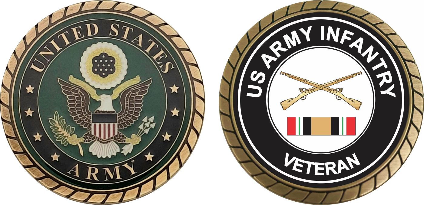This 1 3/4” Army Infantry Iraq Veteran Challenge Coin is proudly offered by MilitaryBest. This Officially Licensed Army coin has beautiful enamel finish on one side and an organized crisp clean Army Infantry Iraq Veteran design on the opposite side.