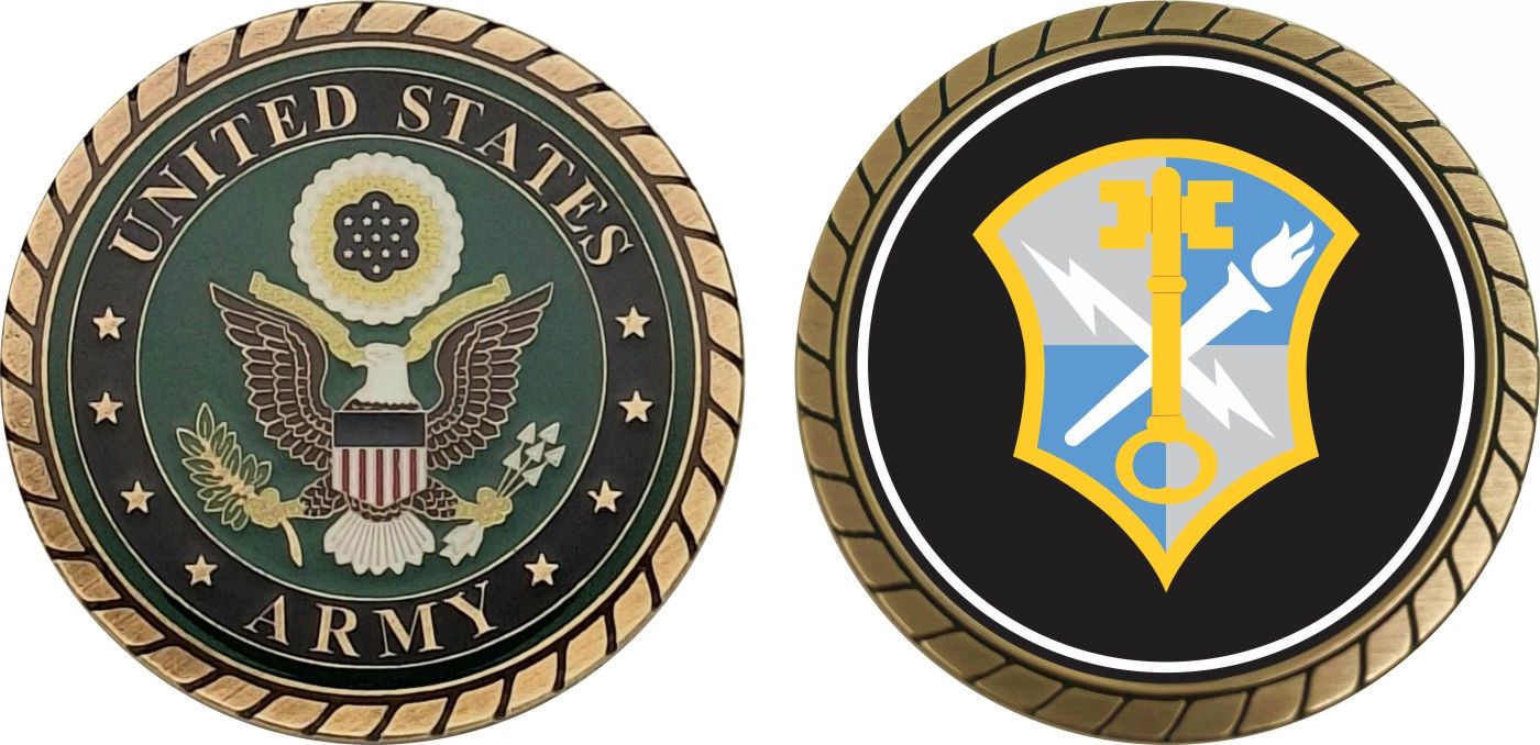 This 1 3/4” Army Intelligence and Security Command Patch Challenge Coin is proudly offered by Militarybest. This Officially Licensed Army coin has beautiful enamel finish on one side and an organized crisp clean design on the opposite side.