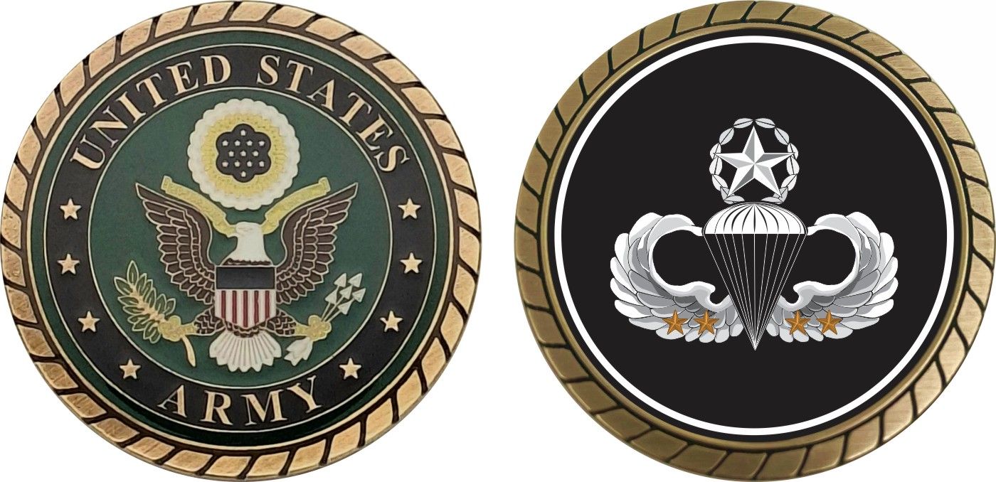 This 1 3/4” Army Master 4 Combat Jump Wings Challenge Coin is proudly offered by Militarybest. This Officially Licensed Army coin has beautiful enamel finish on one side and an organized crisp clean design on the opposite side.