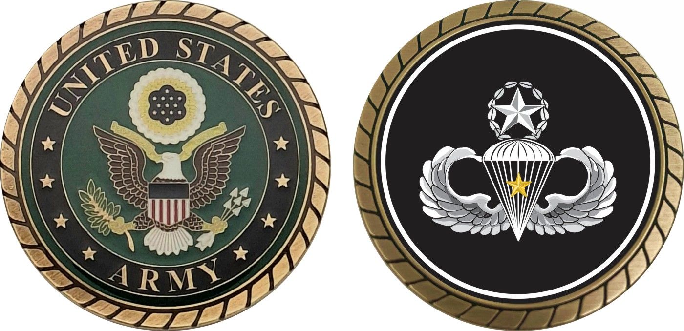 This 1 3/4” Army Master 5 Combat Jump Wings Challenge Coin is proudly offered by Militarybest. This Officially Licensed Army coin has beautiful enamel finish on one side and an organized crisp clean design on the opposite side.